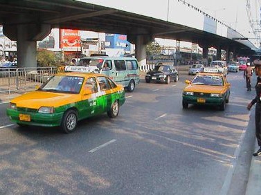 Outro meio acessível são os táxis. Pode chamar um taxi diretamente do hotel ou facilmente encontrará na rua. Geralmente os preços são fixos, mas confirme antes de entrar. Pode encontrar táxis com a palavra “taxi-meter” no tejadilho do carro. Esses serão mais baratos e o preço dependerá do percurso realizado, bem como da duração do mesmo. O condutor terá de ativar esse letreiro quando entrar no táxi, caso contrário poderá abandonar o mesmo. Além disso, certifique-se que o contador está no valor base antes do táxi iniciar a viagem. Não dê ouvidos a promoções especiais e não aceite ir para qualquer local ou loja de seda que lhe proponham. Um trajeto curto pode rondar 50 a 80 THB.