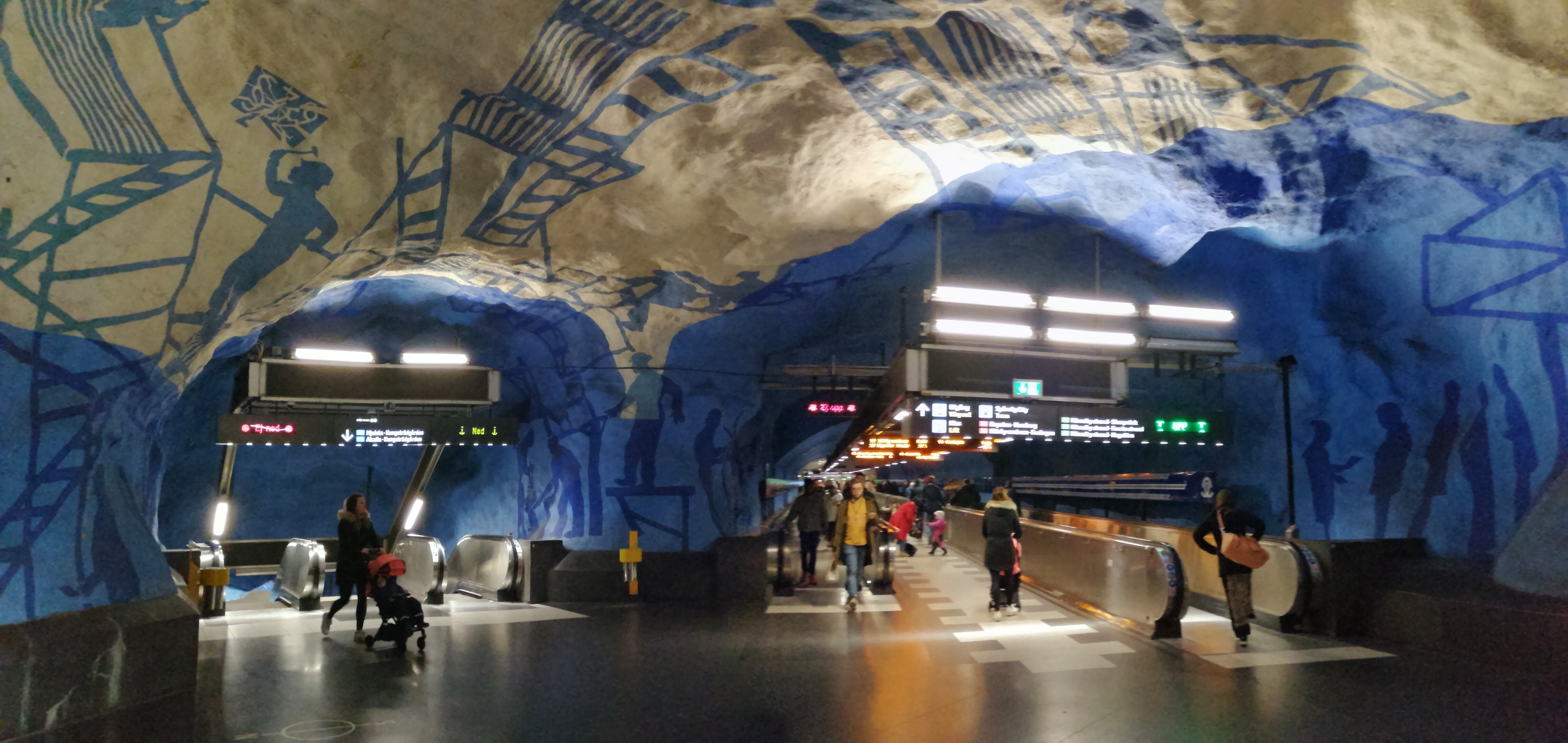 Visitar Estocolmo e não andar na linha de metro (Tunnelbana) desta cidade é impensável. As estações de metro da cidade são verdadeiras exposições de arte. A maioria das estações está decorada com esculturas, mosaicos, iluminação especial, azulejos, pinturas, gravuras, relevos de mais de 150 artistas e o resultado é formidável. Nós chegámos ao ponto de reservar uma manhã para fazer um tour para visitar algumas delas. Abaixo deixo algumas sugestões que considero merecerem destaque: