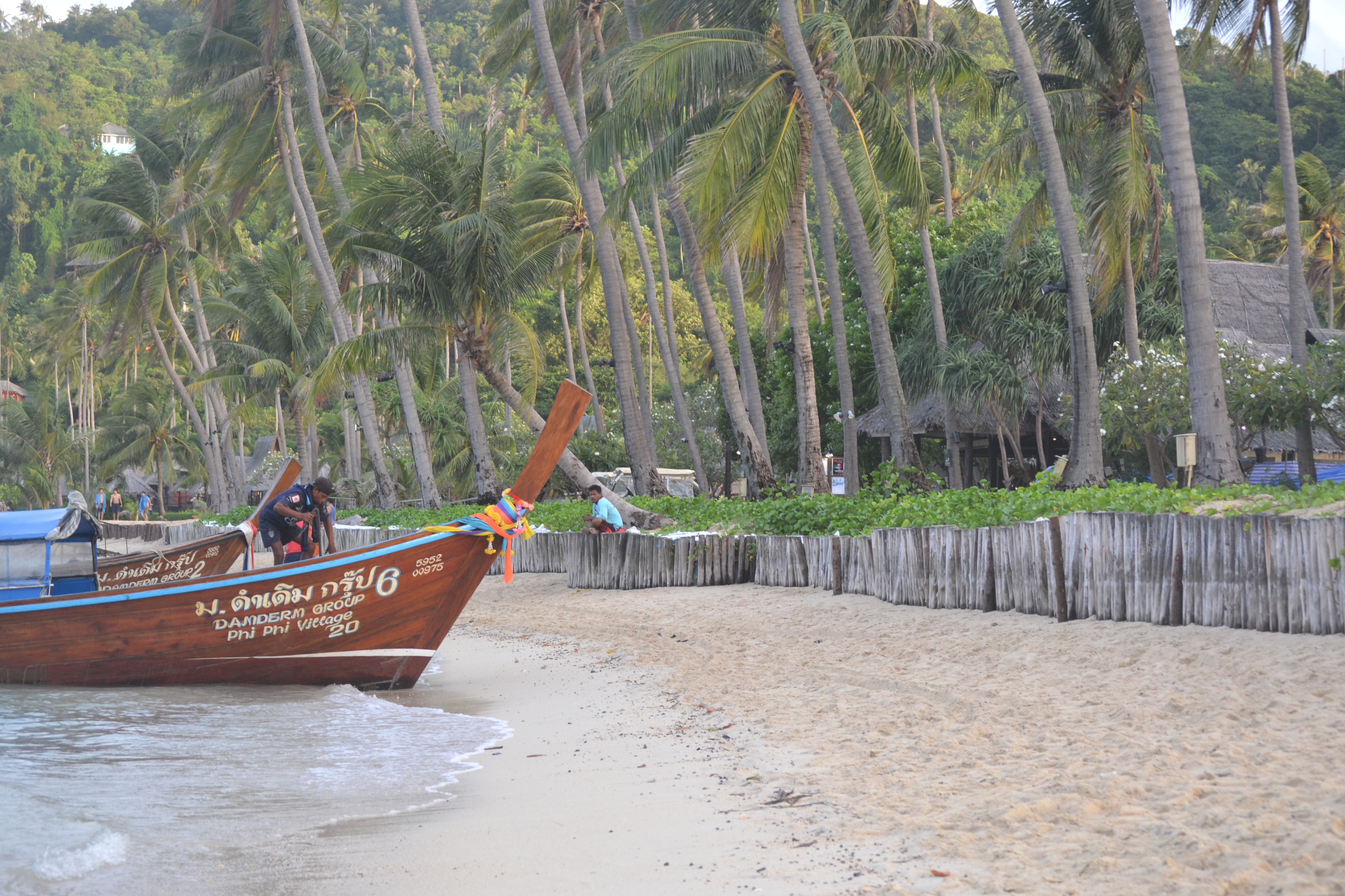 Depois do check in feito (ver o hotel que escolhemos em Hotéis), saímos como de costume para conhecer o hotel e as redondezas. O hotel está bem localizado, contudo é bastante isolado. Não existe quase nada na envolvência, apenas uma pequeníssima povoação de pescadores que, mais tarde, viemos a “contratar” como guias turísticos. Tal como já tínhamos vivenciado nas Maldivas (ler aqui), aproveitámos o tempo para descansar e conhecer alguns costumes da região. Organizámos um plano rápido e super simples que consistia essencialmente em conhecer a zona central da ilha e alguns recantos que sabíamos serem imperdíveis. A questão era: como vamos? O hotel disponibilizava meio de transporte, contudo não estava incluído e não era o que pretendíamos em termos de custo. Todos os dias à mesma hora observávamos dois homens e uma lancha localizados junto à praia, que por vezes víamos partir com turistas a bordo. Numa tarde, fomos questioná-los e descobrimos que faziam estas viagens e o preço era mais acessível. Reservámos então a manhã seguinte para conhecer o centro de Phi Phi Don.