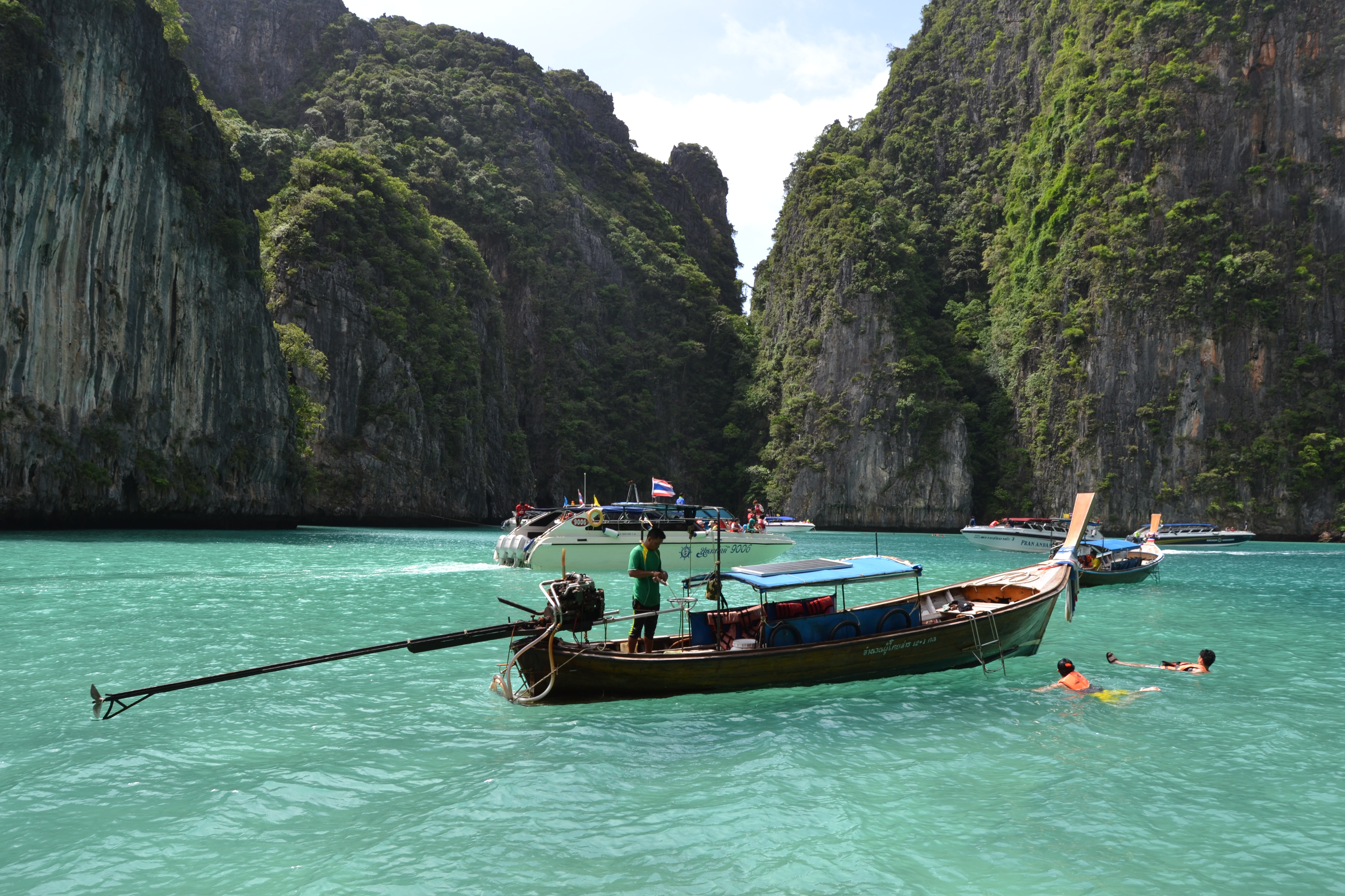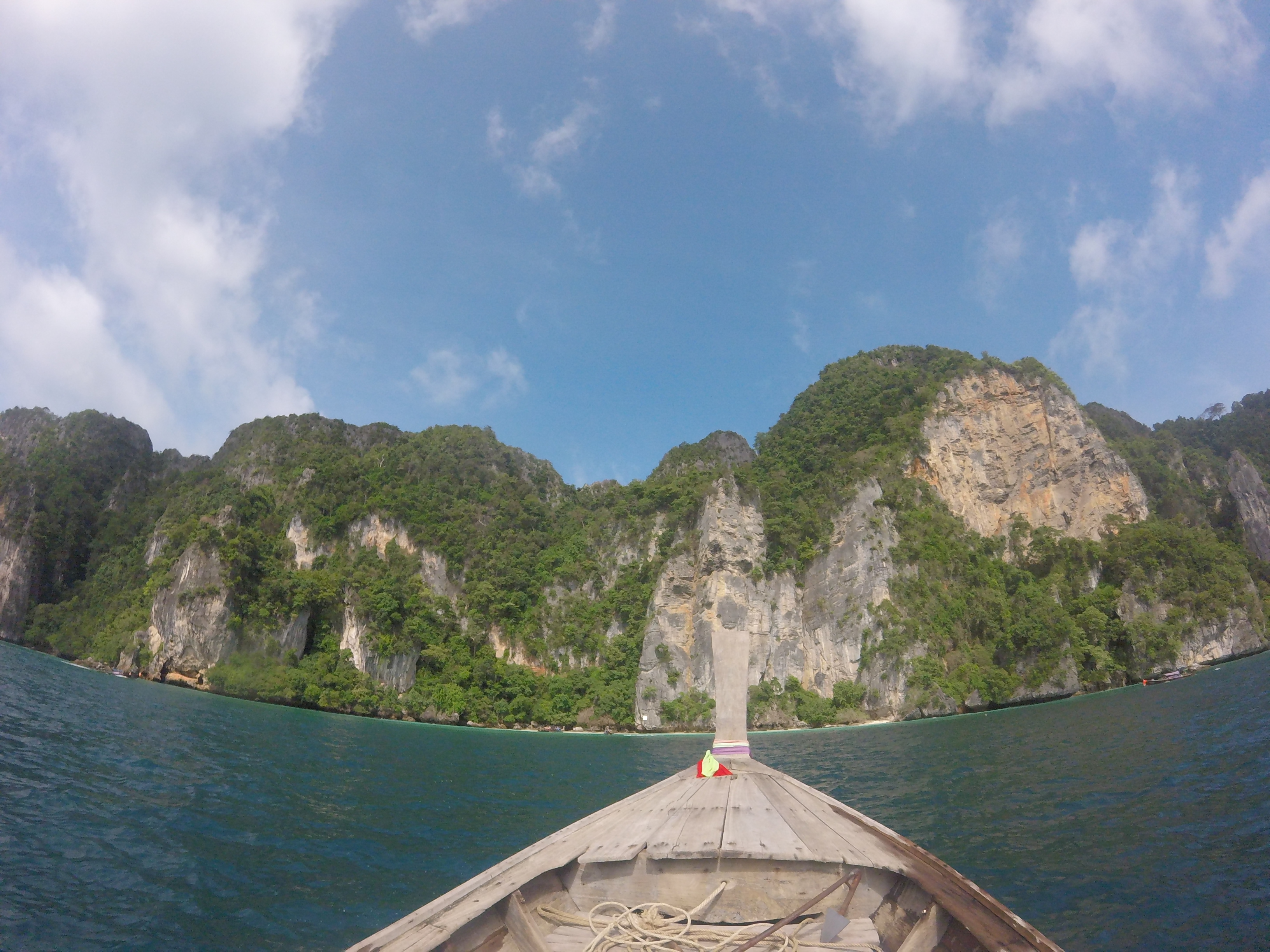 Como já disse em outros artigos sobre a Tailândia, sobretudo fora das zonas citadinas, a maioria dos tailandeses não falam fluentemente inglês pelo que a comunicação é bastante engraçada. A comunicação com o pescador foi feita gestualmente mas acreditem que suficiente para nos fazermos entender. Desta feita, percebemos que naquele dia as condições climatéricas não eram as melhores e o pescador transmitiu-nos isso. Além disso, tinham fechado a entrada principal para a baía de Maya Bay por causa do mau tempo e tínhamos que entrar pela lateral e atravessar a floresta a pé até chegarmos à praia. Insistimos com ele: queríamos ir. Ele sorriu para nós, como se estivesse a troçar, e entregou-nos os coletes sal-vidas. Ficámos apreensivos, a olhar uns para os outros, mas fomos afinal também tínhamos pago para isso. A viagem até Maya Bay foi relativamente demorada ou pelo menos pareceu (cerca de 30 minutos), a ondulação era forte e o tempo estava de facto a mudar à medida que nos aproximávamos de Maya Bay. As razões para a apreensão ficou consolidada quando por fim o pescador desliga o motor do barco e transmite-nos que podíamos ir. Ele ficava no barco à nossa espera… Estavamos a sensivelmente dez metros da escarpa rochosa, sem pé e com a ondulação relativamente agitada. Havia uma escada contruída com cordas por onde alguns turísticas estavam a subir. Lá em cima, aguardavam dois ou três homens que ajudavam a subir e estavam a receber uma pequena quantia pela entrada. A vontade em conhecer o local era tanta que lá acabámos por nos lançarmos à água.