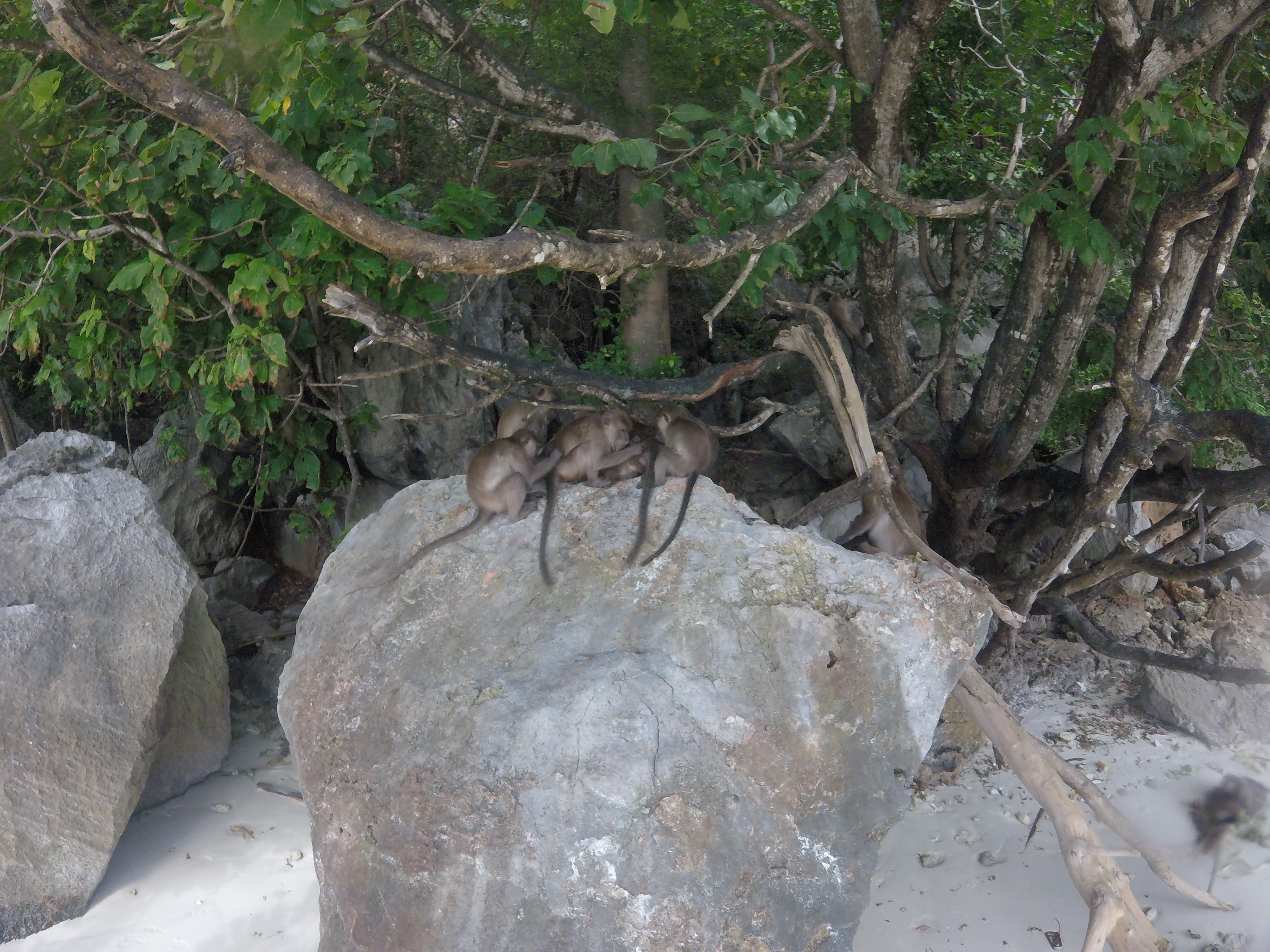 Monkey Beach, como o próprio nome indica (praia dos macacos), é uma praia formidável e exclusiva às inúmeras famílias de macacos que nela habitam. Lamentavelmente e apesar dos inúmeros avisos existentes no local, os turísticas distraem-se mais com os macacos do que propriamente com a beleza natural da praia, insistindo em dar alimentos aos animais. Sim, tirámos muitas fotos mas também mergulhámos muito, porque a praia e a água são sensacionais.
