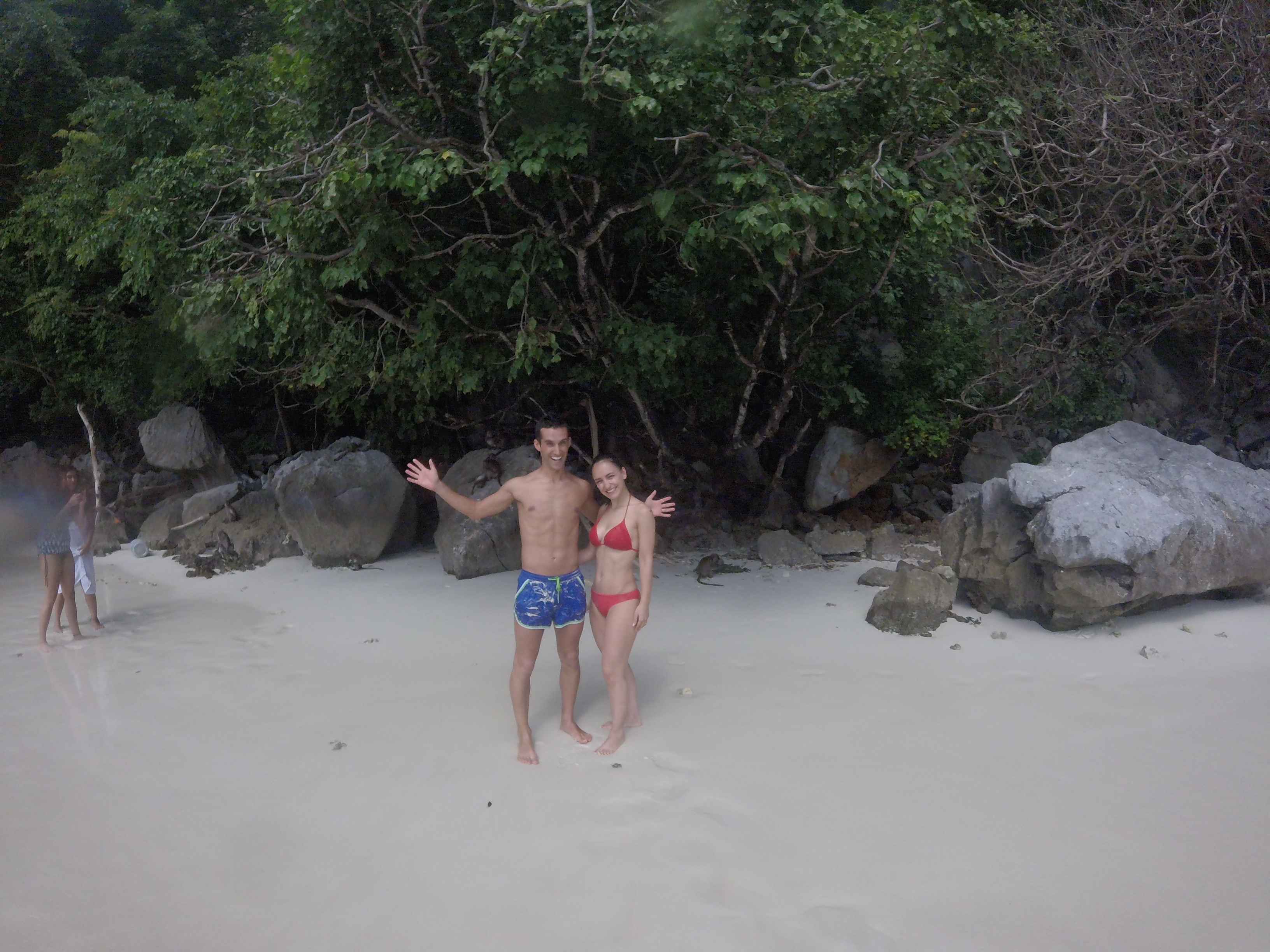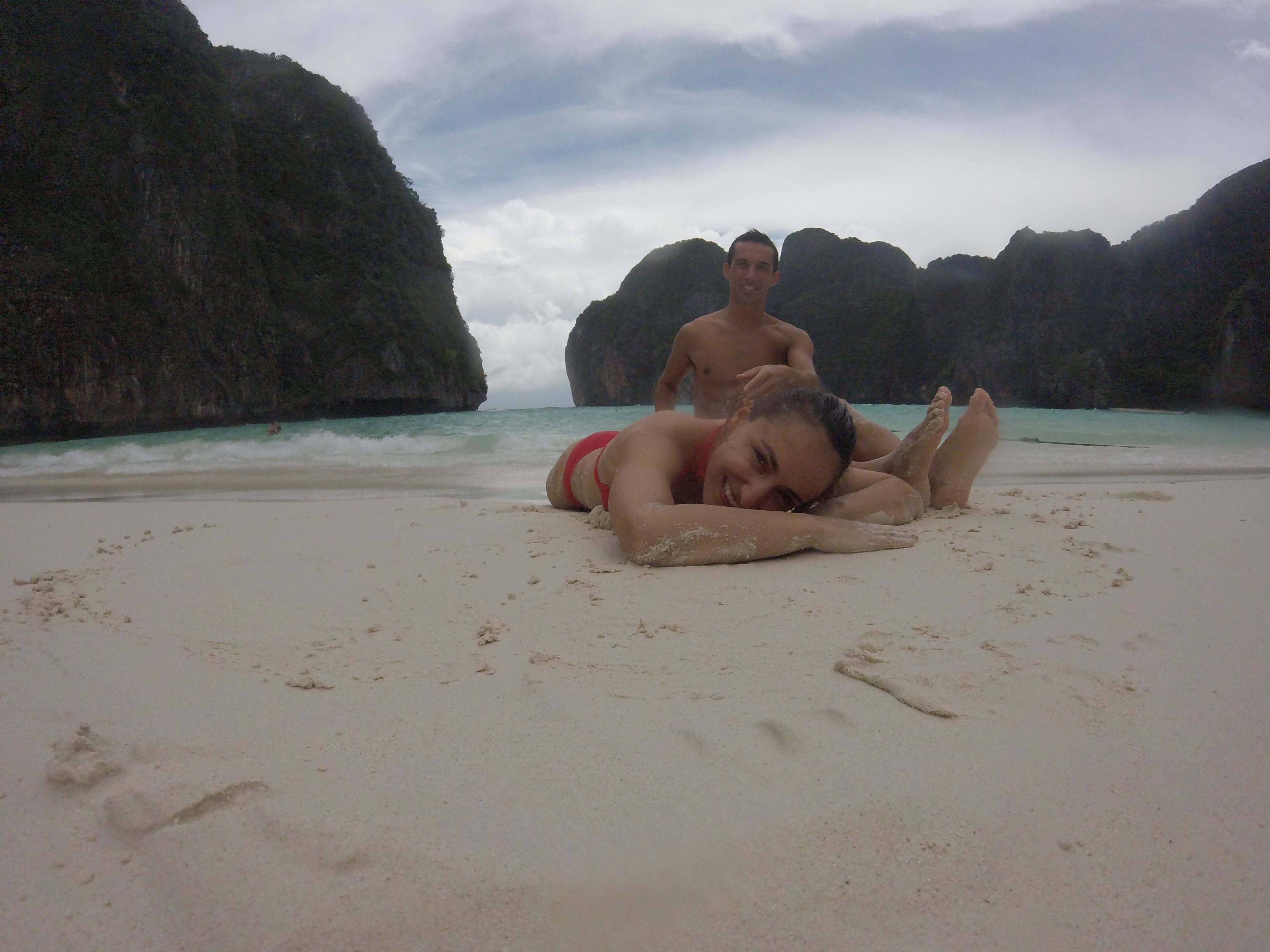 Apesar da água agitada, conseguimos entrar na ilha de forma relativamente tranquila. Percorrermos um pequeno caminho pedestre pelo interior da ilha e chegámos finalmente à famosa praia “Maya Bay“, localizada como já referi na ilha desabitada de Phi Phi Leh. A praia é realmente belíssima porque trata-se de uma baia de água quente, de cor turquesa, rodeada de rochas por todos os lados à exceção de uma pequena abertura por onde entram e saem os barcos. Quem procura imagens desta praia num qualquer motor de busca encontra imensas fotos com a praia cheia de pessoas e a água quase escondida pelos barcos. Por este motivo existem muitos ambientalistas que alertam para o nível de poluição existente, que está a afastar a vida selvagem deste local e que nos deixou de facto sensibilizados para a necessidade de a preservarmos. Por estar mau tempo, conseguimos entrar, não vimos multidões de pessoas nem qualquer ruído excessivo. Aproveitámos todos os minutos, tentando minimizar o mais possível os impactos ambientais associados à nossa visita.