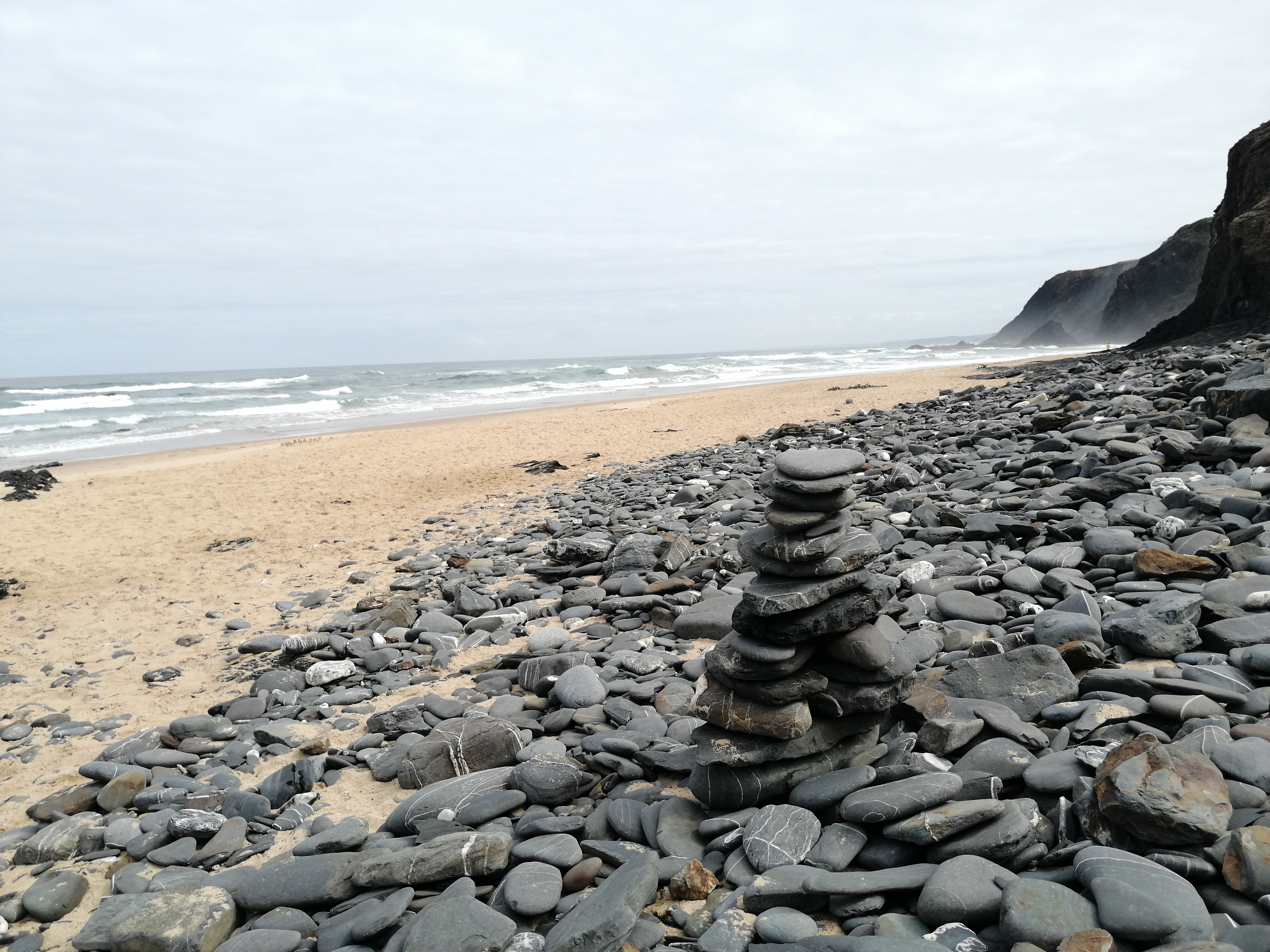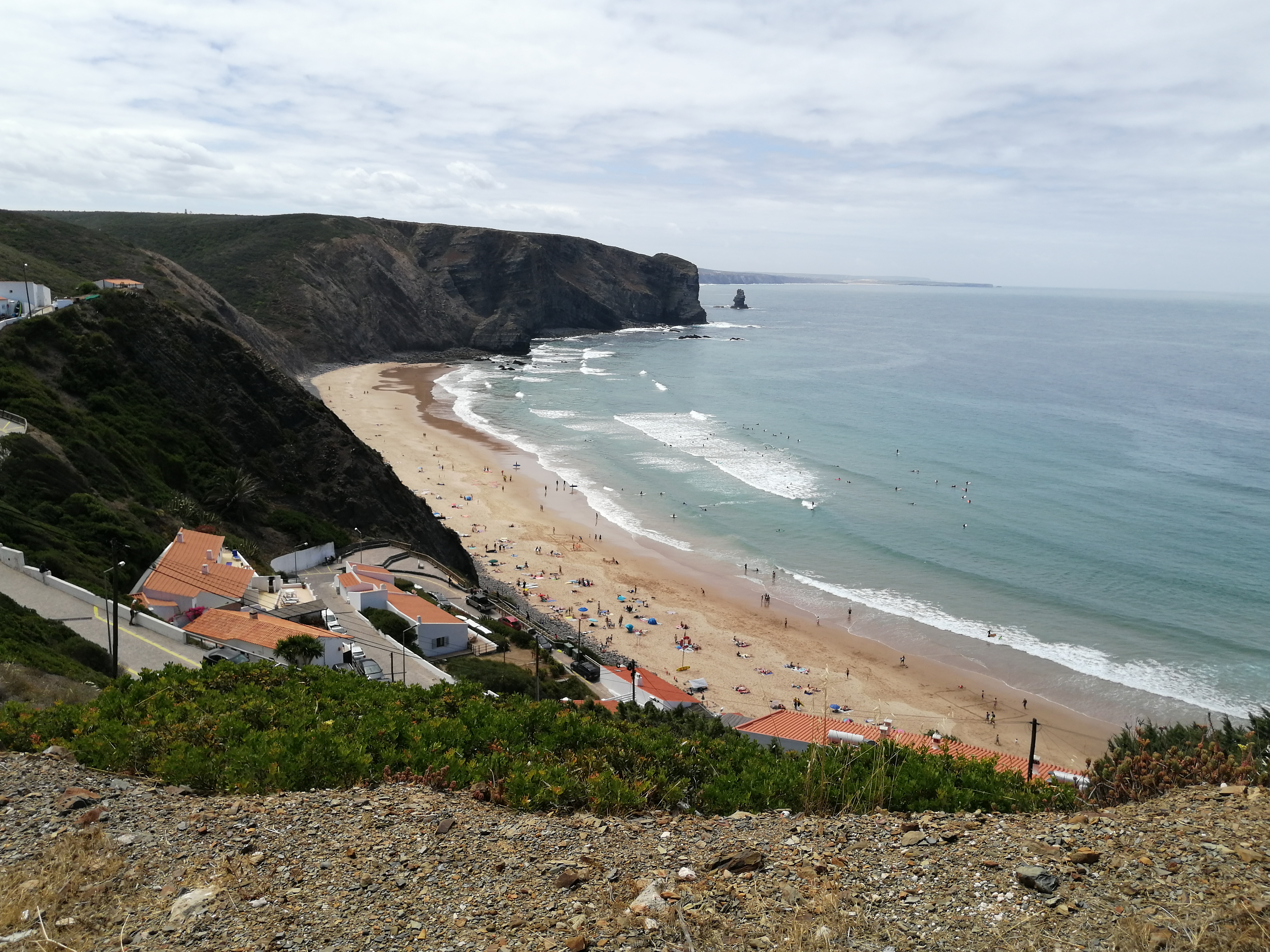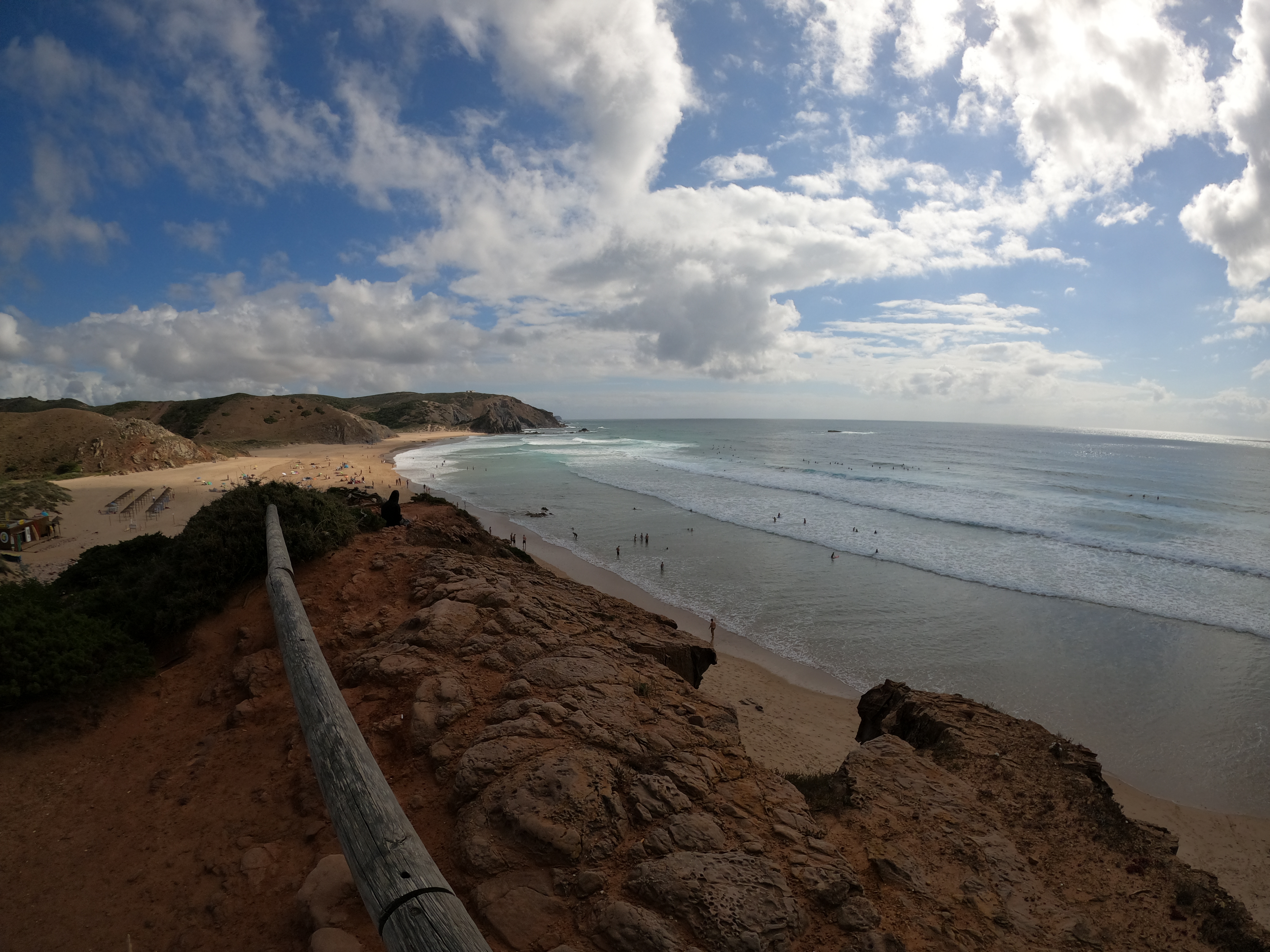 Acordámos e de imediato saltámos para o exterior da autocaravana. Estava um dia agradável mas o sol estava “envergonhado”, pouco melhor do que o final do dia anterior. Percorremos o topo da encosta e de imediato percebemos que estávamos novamente numa praia selvagem. Sem urbanismo nem comércio, nada que atraísse atenções excessivas, apenas a natureza praticamente intocável. Estávamos na praia Vale dos Homens! Que linda!