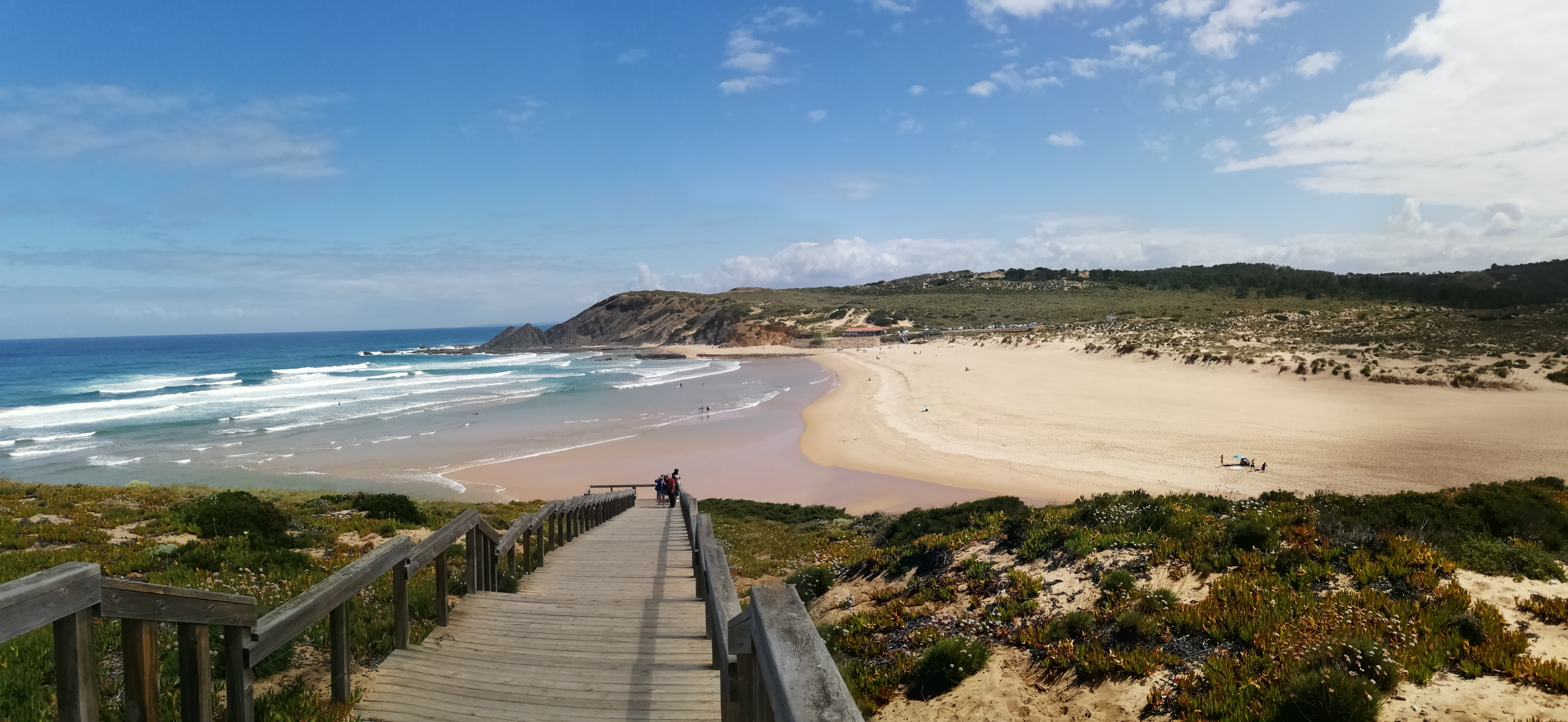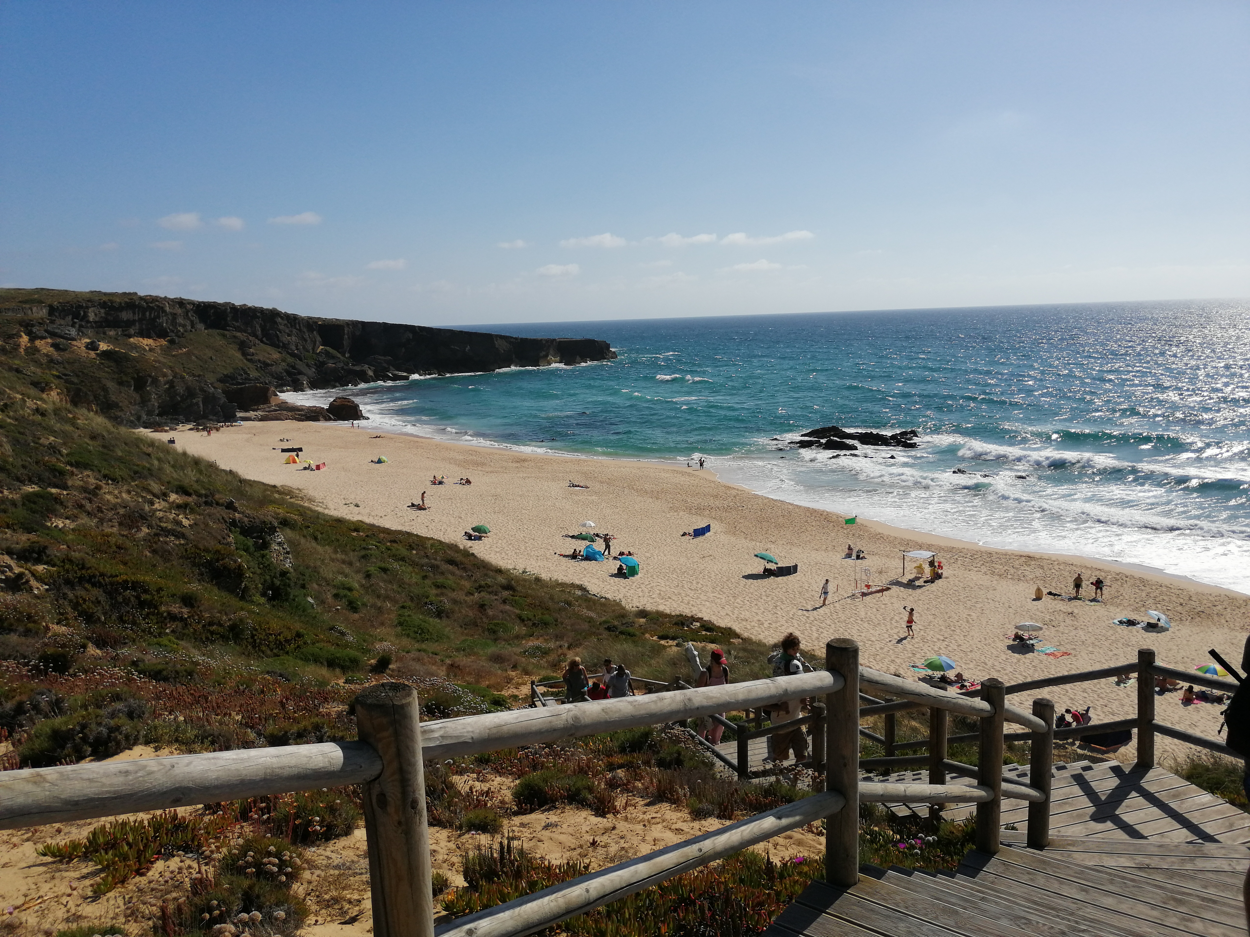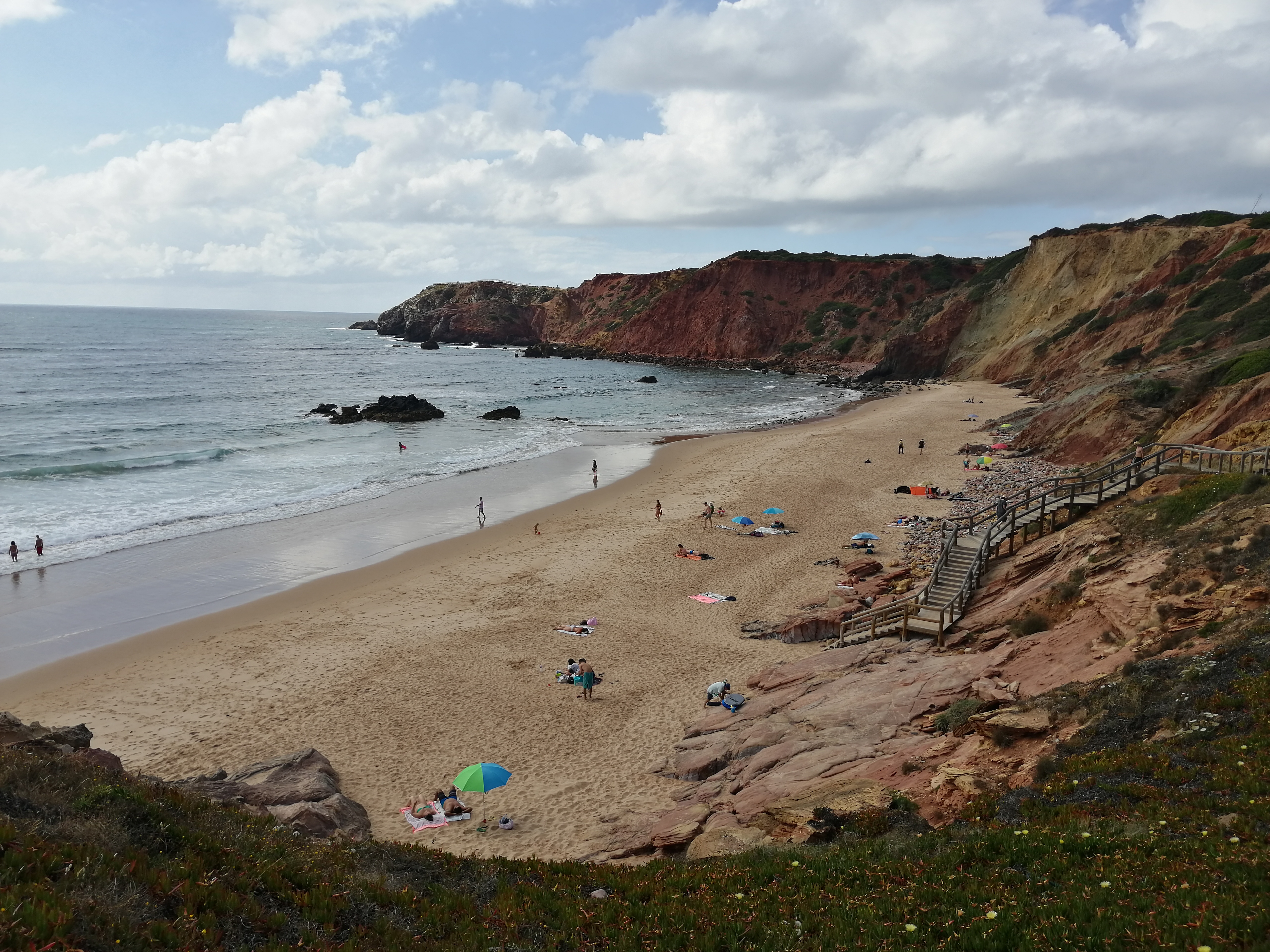 Ao chegar voltámos a ver as falésias e no fundo o areal convidativo para mais uma merecida paragem. Estava vento mas mesmo assim não nos tirou a vontade de estender a toalha na areia e dar um mergulho. Existe também uma linha de passadiços que se estende por toda a encosta da praia e os miradouros existentes permitem uma vista deslumbrante sobre a mesma. Vale a pena observar o pôr do sol fantástico a partir daqui.