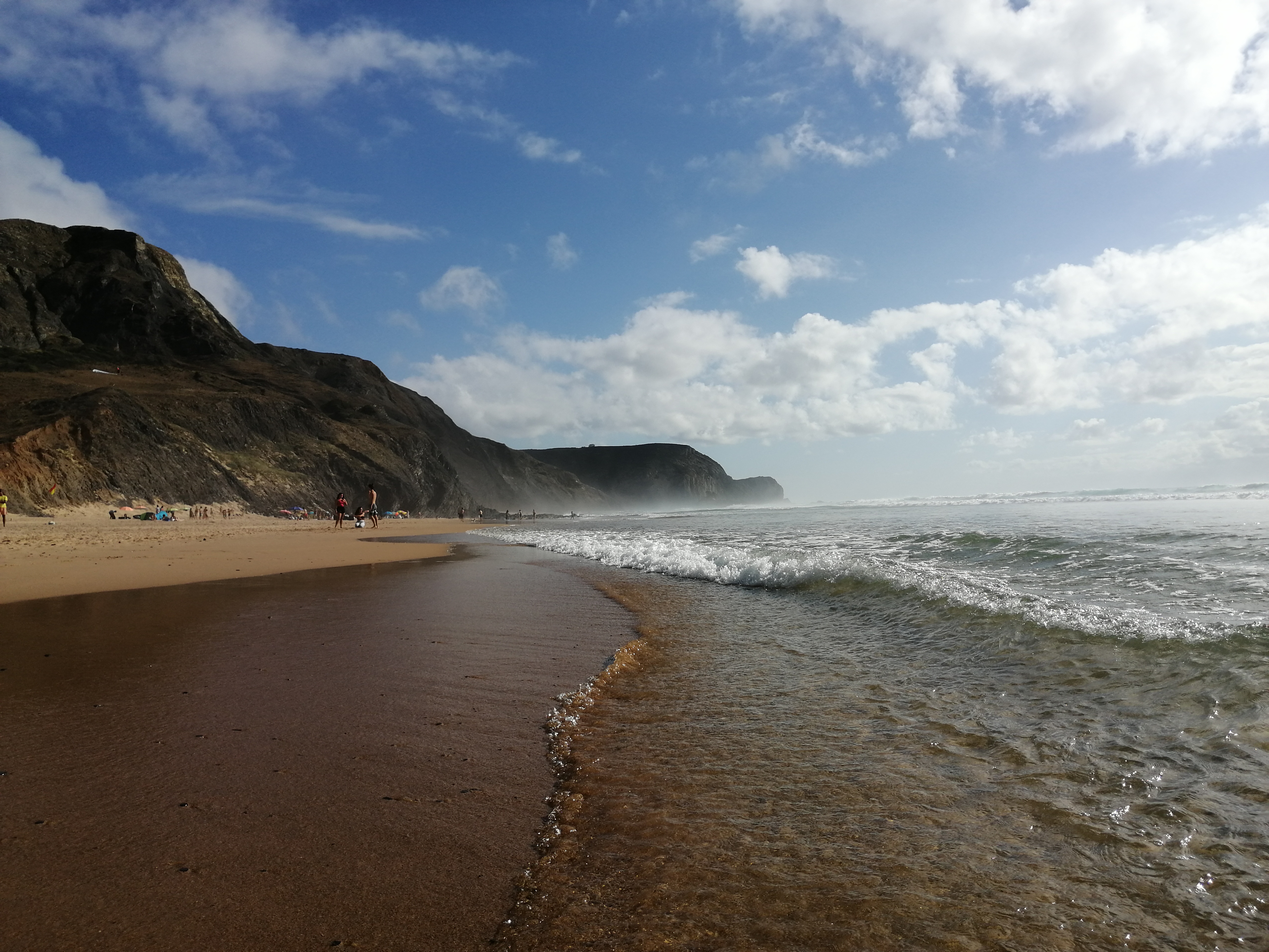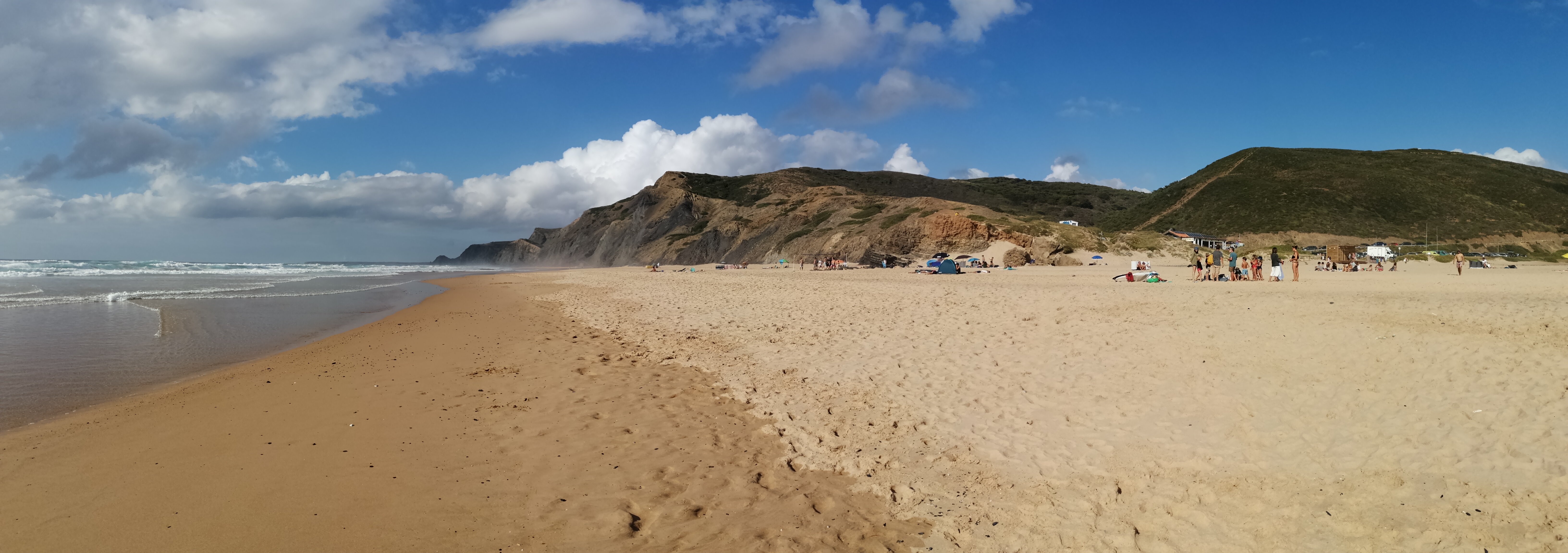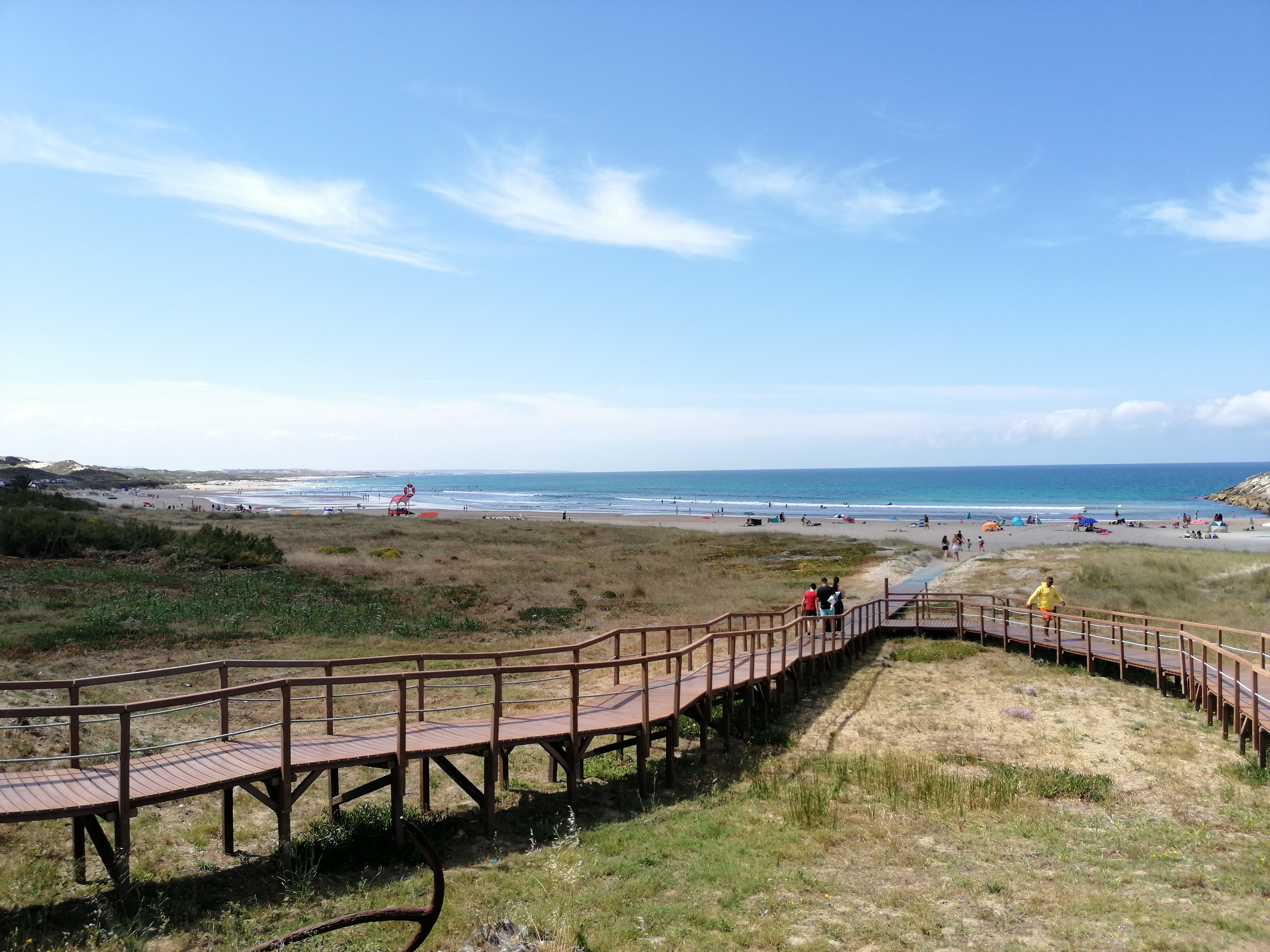 Ao chegar voltámos a ver as falésias e no fundo o areal convidativo para mais uma merecida paragem. Estava vento mas mesmo assim não nos tirou a vontade de estender a toalha na areia e dar um mergulho. Existe também uma linha de passadiços que se estende por toda a encosta da praia e os miradouros existentes permitem uma vista deslumbrante sobre a mesma. Vale a pena observar o pôr do sol fantástico a partir daqui.