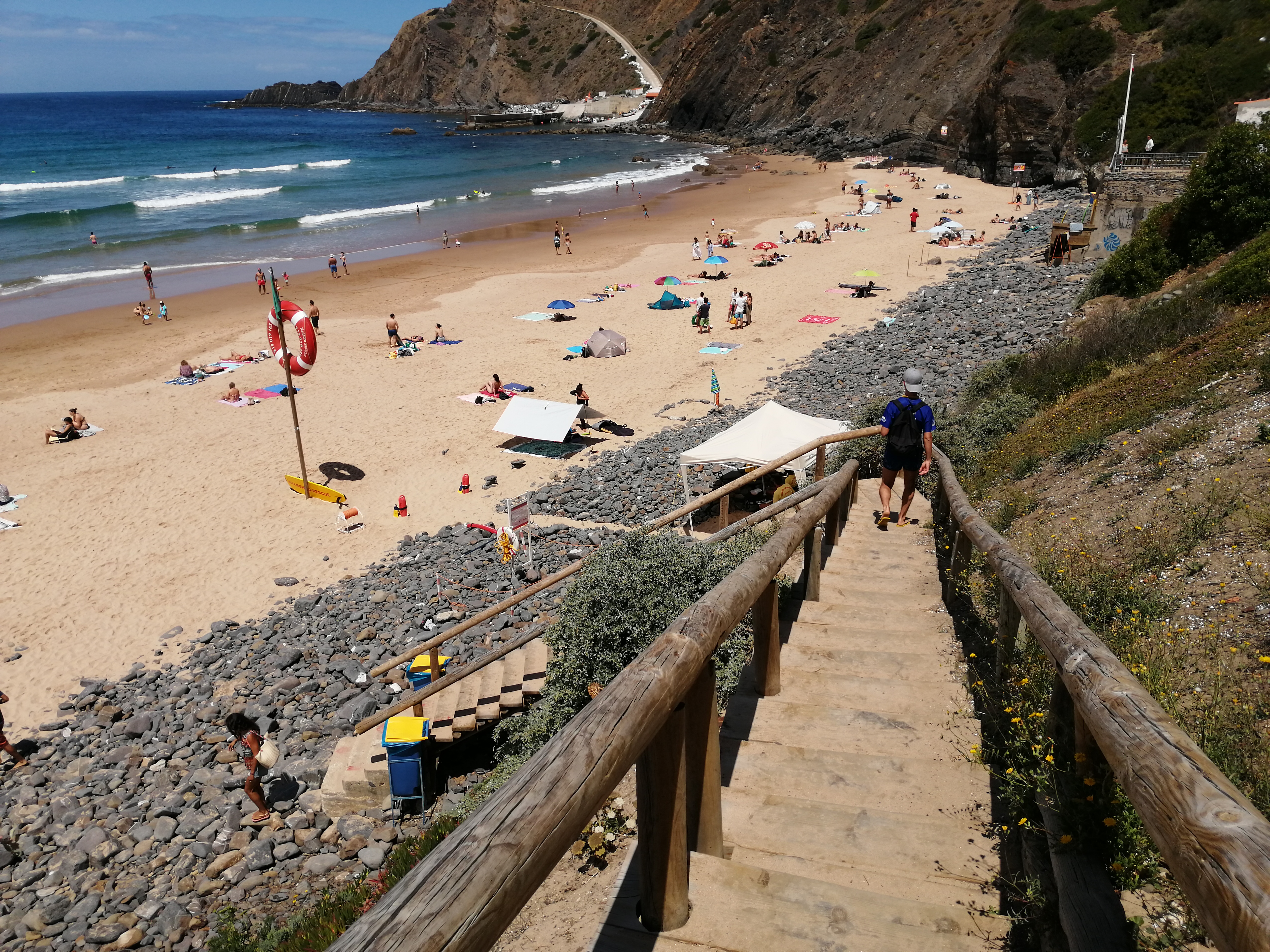 A praia está localizada entre Odeceixe e Aljezur e, para descer até ao areal, tivemos que aceder a uma longa escadaria em madeira, a única mão humana presente no local. A paisagem é de cortar a respiração e vale a pena parar e relaxar umas boas horas.