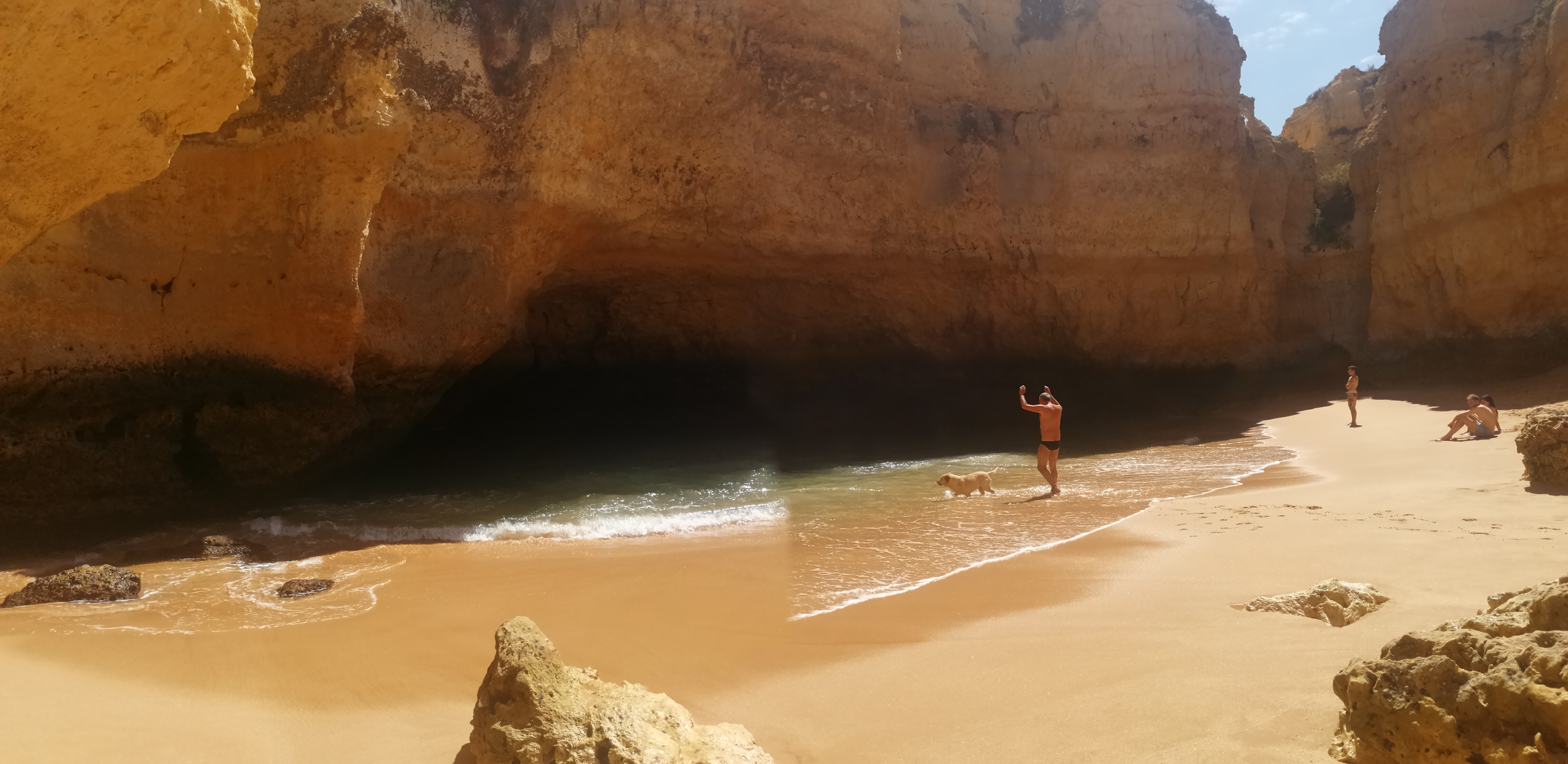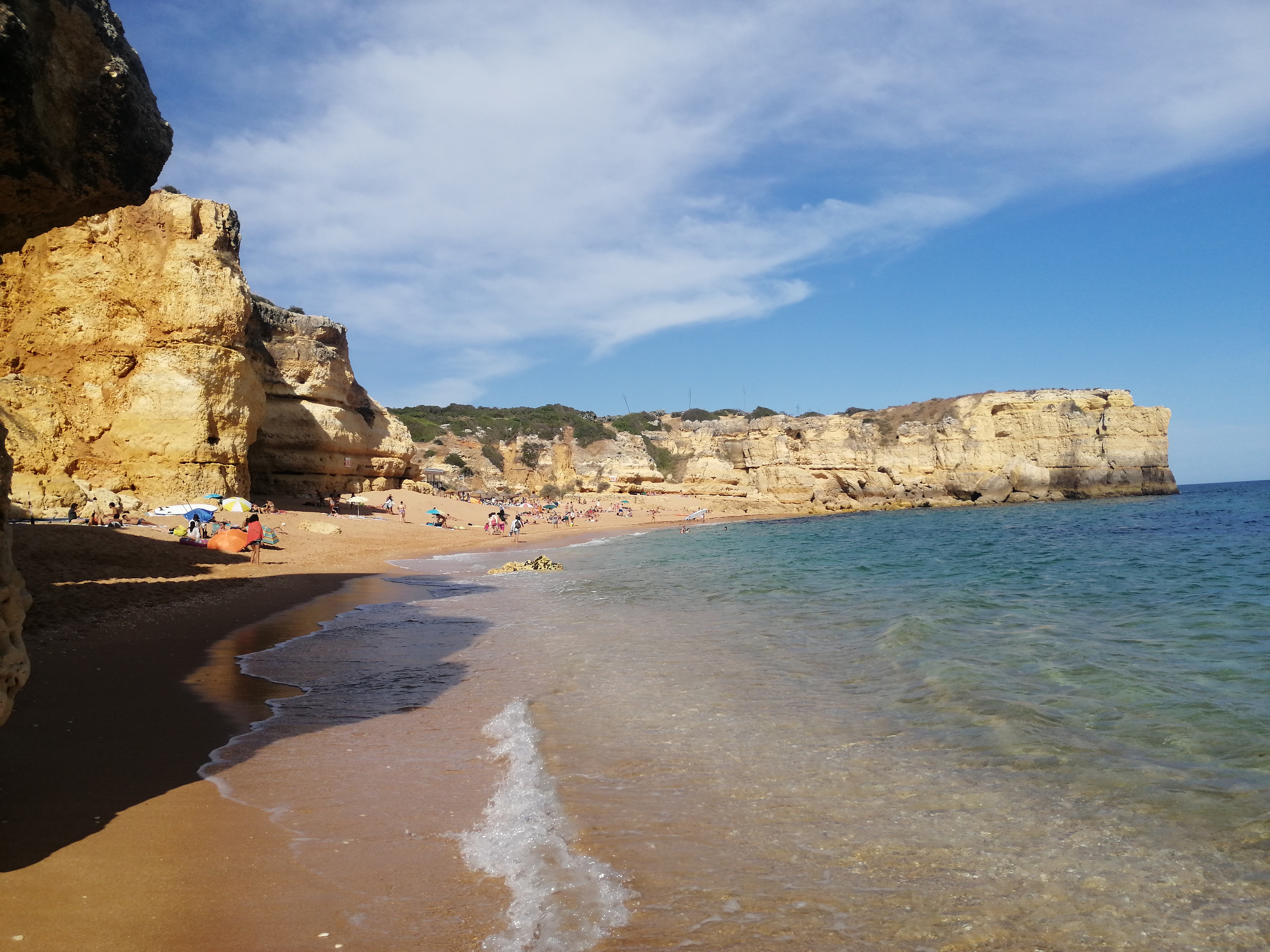 A paragem seguinte foi na praia da Coelha, bem perto de Albufeira. Esta praia é já bem mais conhecida pelos banhistas e, por isso, não ficámos surpreendidos por a termos encontrado bem mais composta de pessoas. Como a “ginástica” de circular com uma autocaravana na costa algarvia não é tarefa fácil e já cansados de procurar um local adequado para estacionar, acabámos por parar aqui e aproveitar o resto da tarde para uns mergulhos.