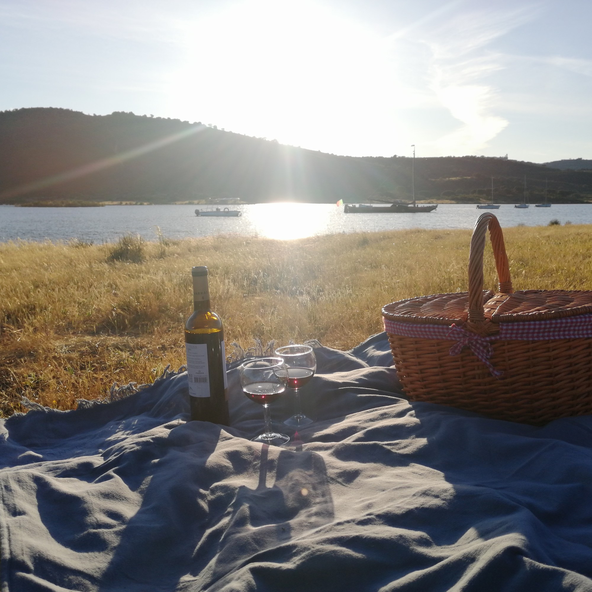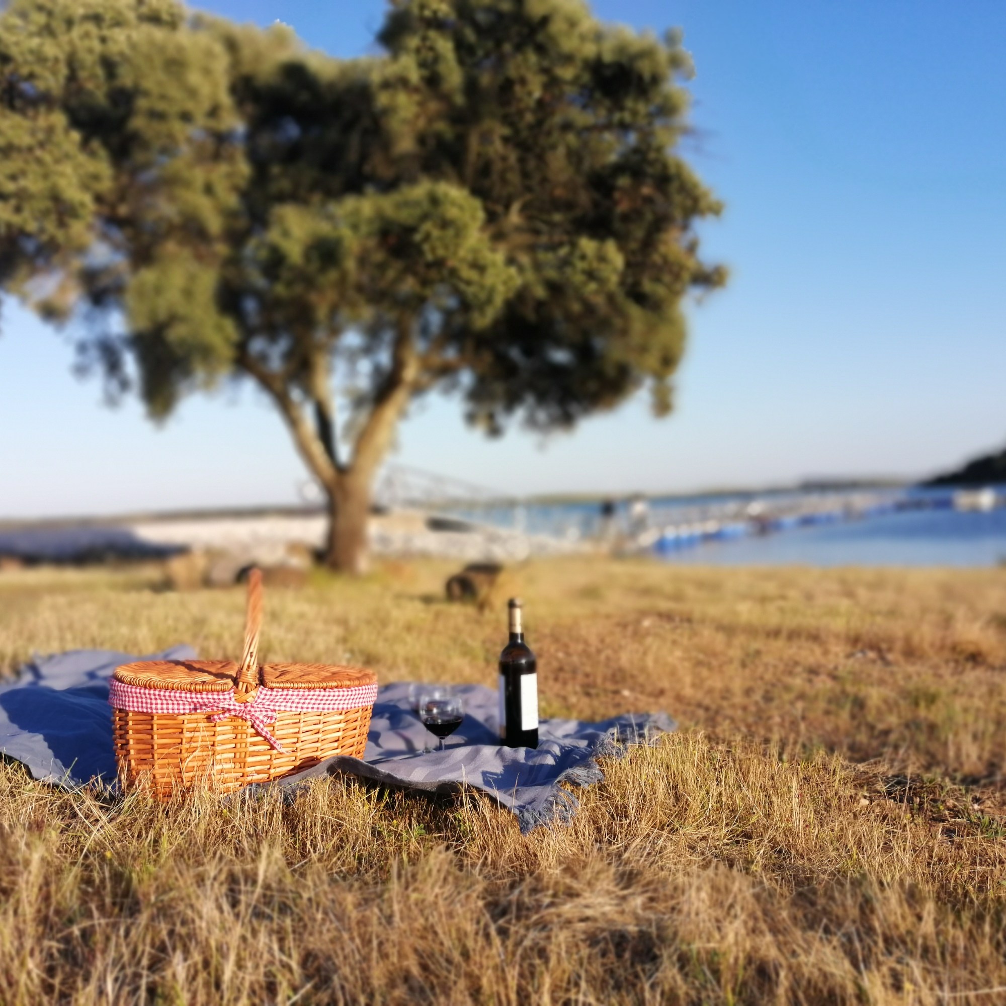 O final do dia aproximava-se e achámos que não podíamos terminar sem visitar a extraordinária Praia Fluvial de Monsaraz. Localizada a cerca de cinco quilómetros e pouco mais de cinco minutos de carro de Monsaraz, encontrámos esta espetacular praia fluvial, incrivelmente localizada numa pequenina península. A praia, além da fabulosa areia branca, possui jardins incríveis não só para apanhar sol, como também de um belo parque de merendas. Por aqui encontrámos também um bar/restaurante de apoio, WCs, um pequeno ancoradouro, entre outros serviços como aluguer de embarcações ou atividades náuticas. É um espaço fabuloso para desfrutar em família e não falta o que fazer! Nós, decidimos levar uma reserva alentejana, especialmente selecionada pelo Magno, e uns aperitivos para aproveitar aquele final de tarde primaveril bem solarengo.