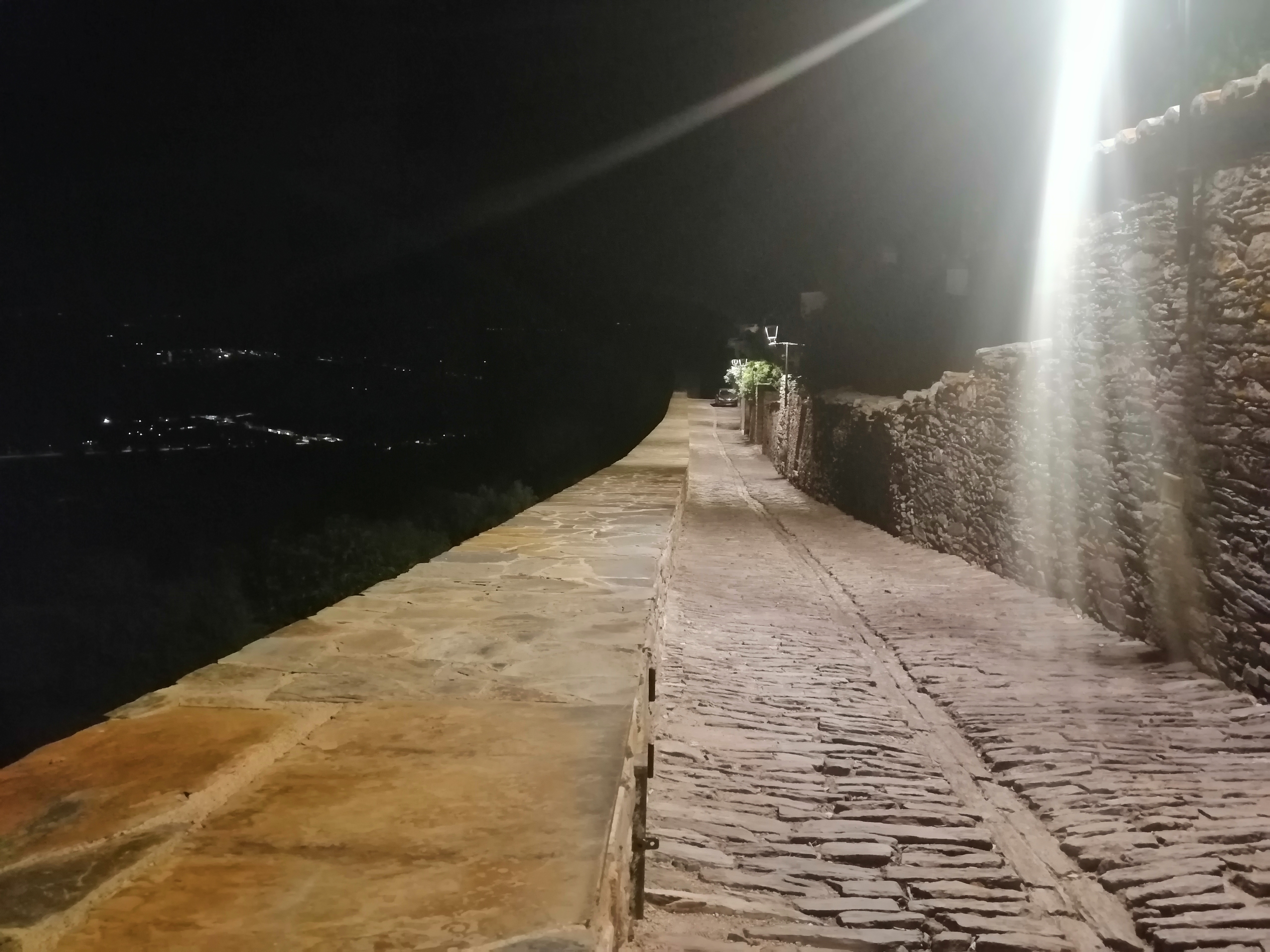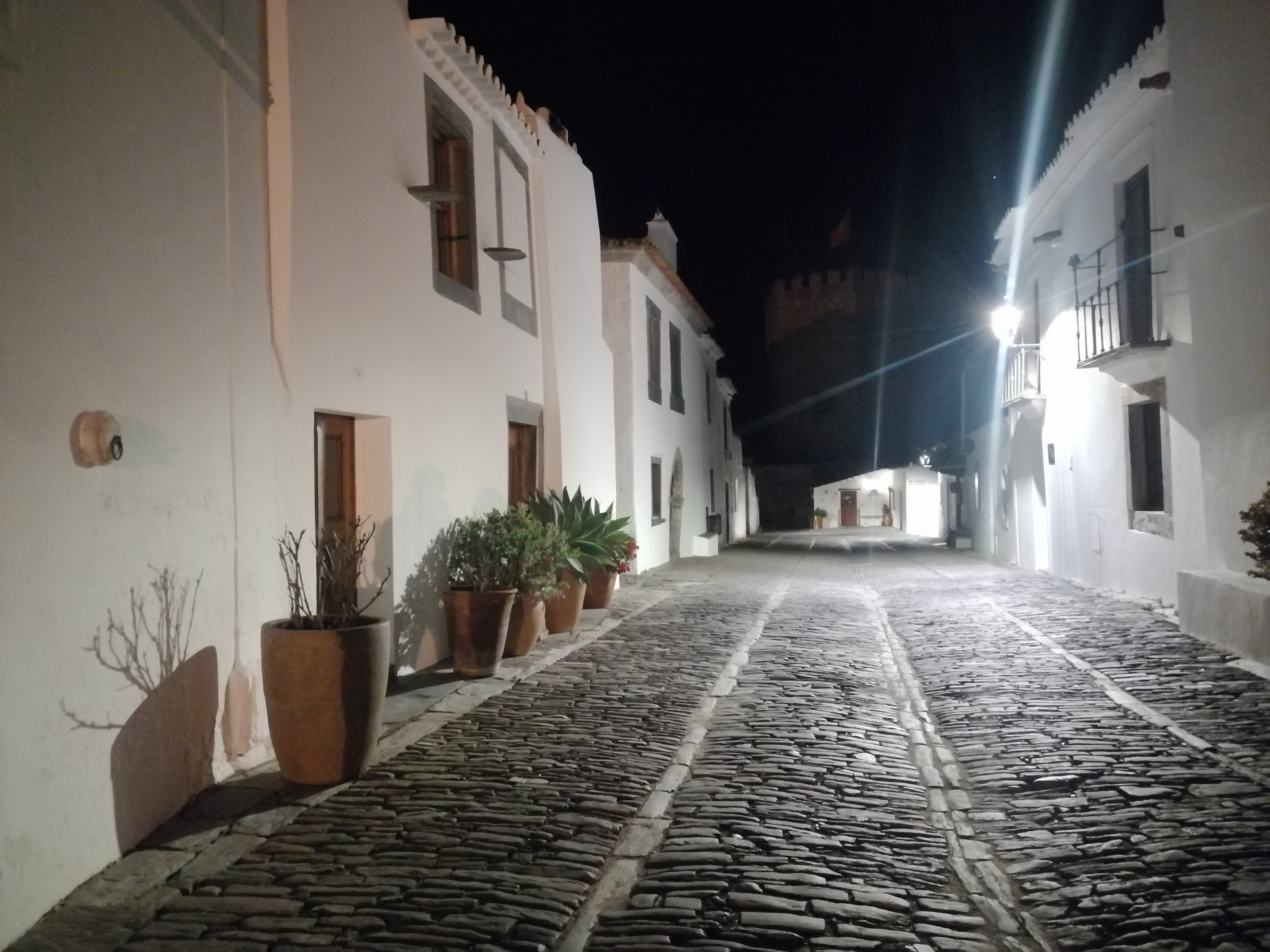 Depois de jantar, avançámos pelas ruas de Monsaraz. Ainda não tínhamos deambulado pelo interior da vila e, à medida que avançávamos, a curiosidade aumentava a cada esquina contornada. As ruas estavam desertas e incrivelmente silenciosas. Que tranquilidade, que serenidade… É verdade que não demorámos muito a dar a volta, mas a vontade de ficar, parar, sentar num degrau de uma casa ou no beiral da muralha cresce à medida que percorremos as ruas de Monsaraz. Voltámos à porta de entrada que nos tinha recebido na noite anterior e de novo contemplámos a brutalidade da paisagem: Monsaraz continuava arrebatadoramente iluminada.