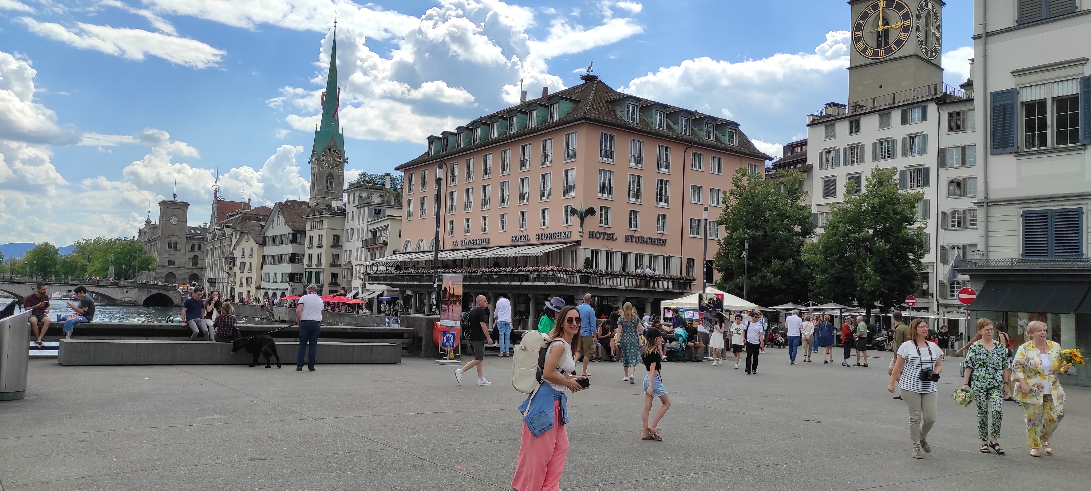 Em Dezembro de 2021 tínhamos estado em Zurique no seguimento de outra viagem, mas a meteorologia não tinha facilitado a visita e esta era a oportunidade para passearmos um bocadinho pela cidade. Chegámos às 12 horas (hora local – mais uma hora do que em Portugal). Procurámos a estação de comboio, comprámos os bilhetes e, 10 minutos depois, estávamos no centro da cidade. Aproveitámos para comprar um almoço volante enquanto nos deslocávamos até às margens do Lago de Zurique. Era o local ideal para almoçar e simultaneamente relaxar enquanto desfrutávamos da bonita paisagem da cidade. Depois de um bom tempo junto ao lago, deambulamos pelas ruas da cidade, parando aqui e ali.