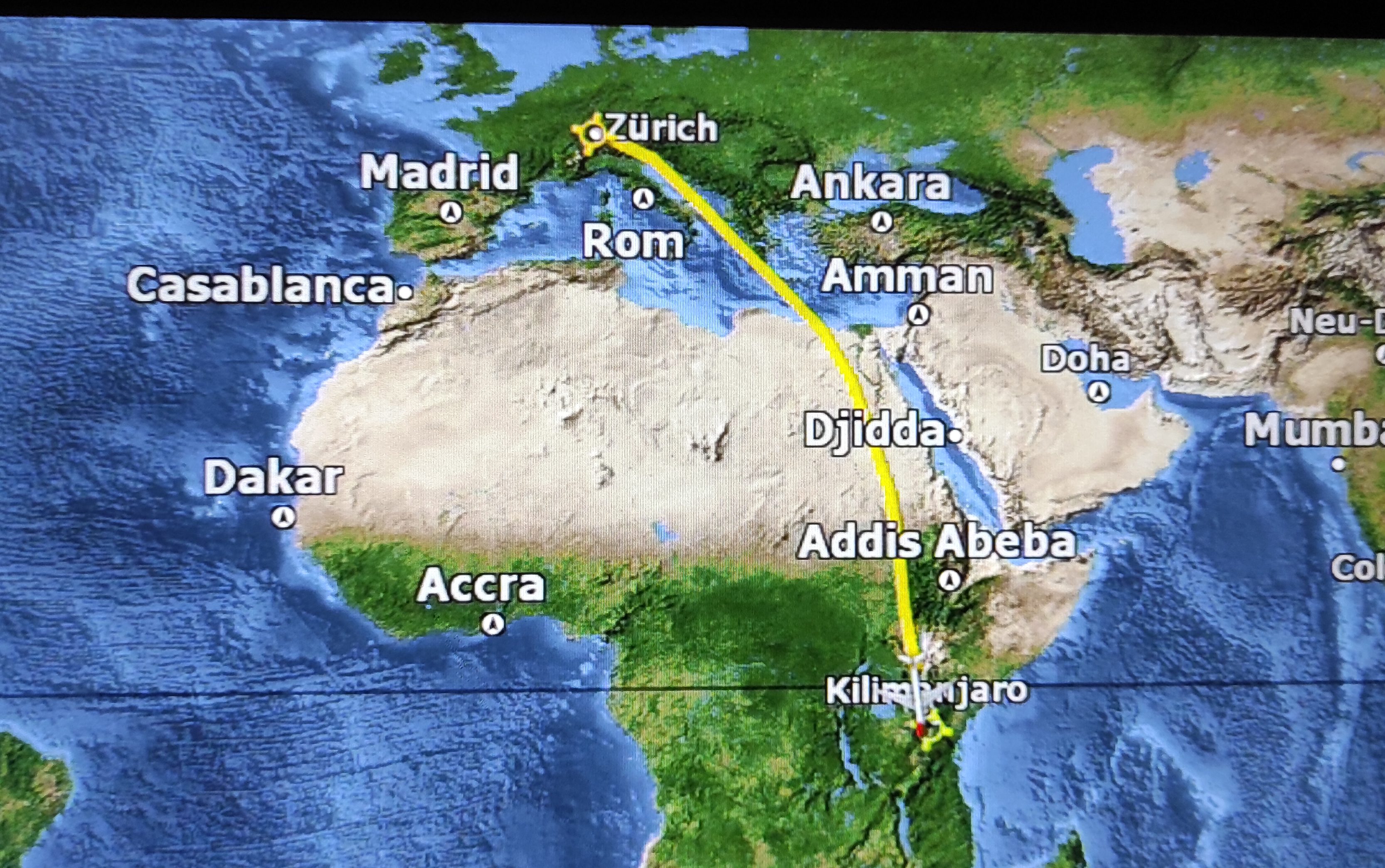 Acordámos cedinho, ainda de madrugada. Estávamos ansiosos! Na mala só faltavam colocar os nossos utensílios de higiene pessoal. O voo era só às 8:40 da manhã, mas quando se trata de aeroportos, a experiência tem-nos dito que não devemos facilitar. Portanto, chegámos ao aeroporto ainda não eram 6h30. O check in estava feito. Faltava apenas despachar a bagagem e, como sempre despachámo-las diretamente para o destino final. O plano era viajar até Zurique, na Suíça (duas horas e meia de viagem), fazer uma escala de 7 horas e posteriormente viajar até Kilimanjaro, na Tanzânia (oito horas de viagem). Plano este que foi escrupulosamente cumprido e garantido.