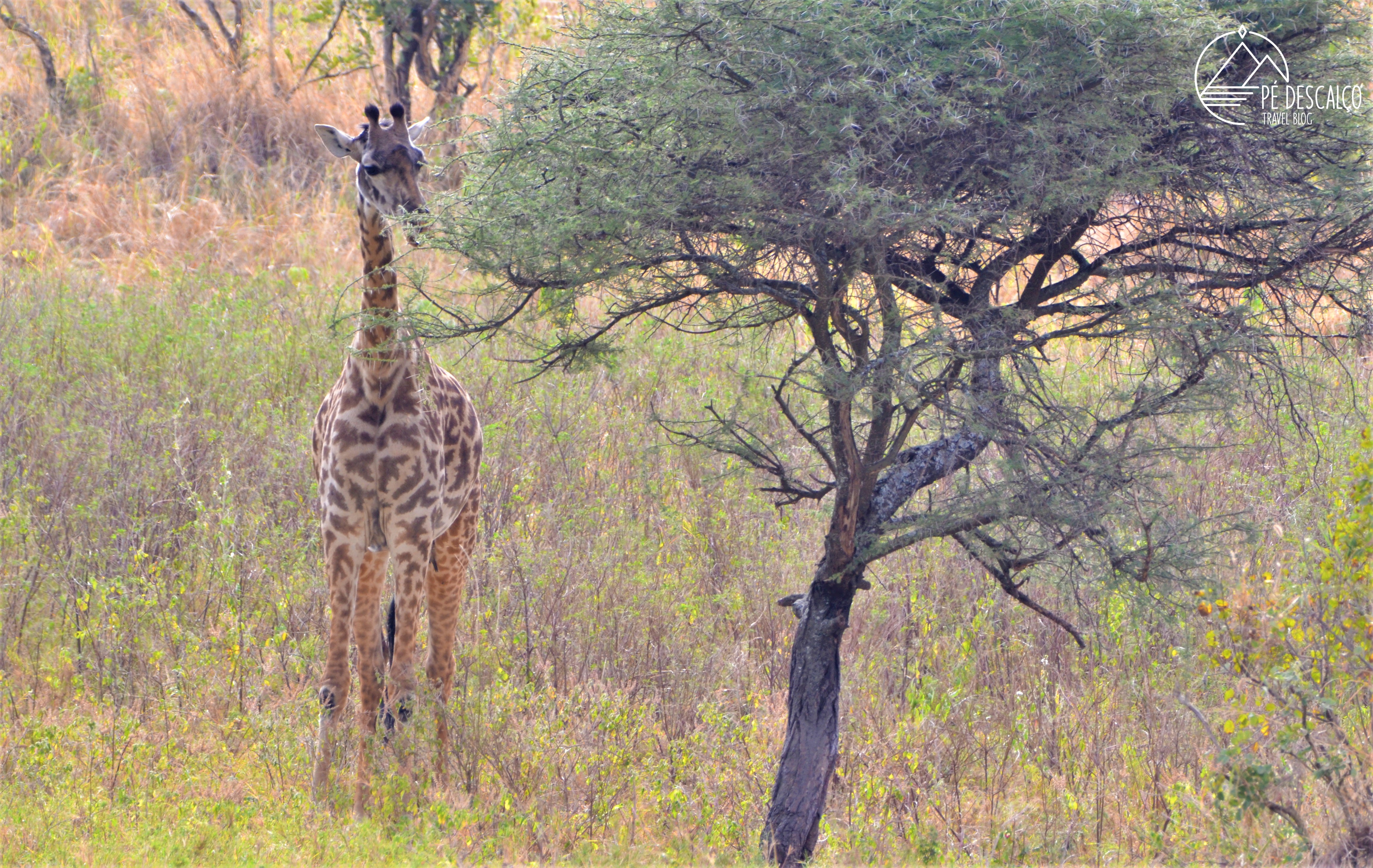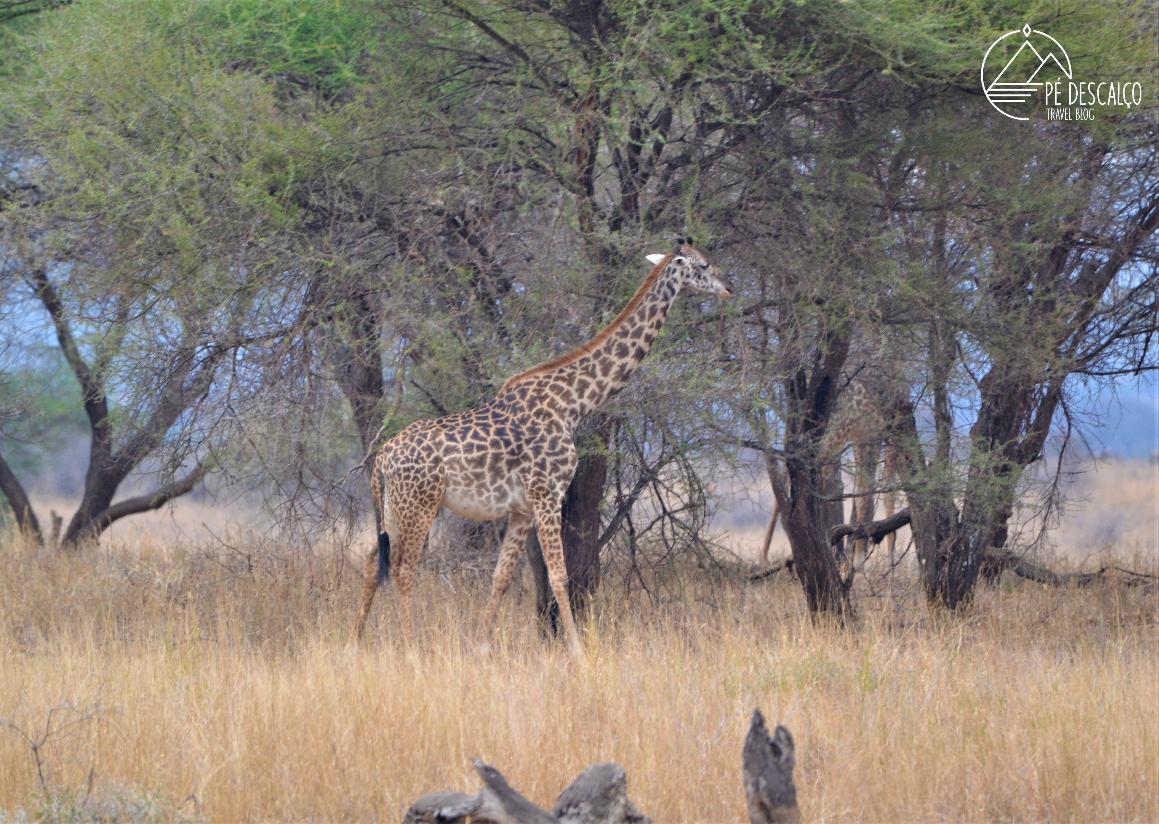 Muito poucos metros mais à frente, também debaixo de outra árvore semelhante à anterior e junto à estrada que seguíamos, encontrámos uma girafa. Estava tão perto de nós. Era de facto a maior girafa que vimos até então. Era enorme, facilmente arrancava as folhas mais altas da copa da árvore. Podemos ver-lhe todos os contornos dos músculos e a timbragem do pelo. Uma vez mais, o Saimoni deixou-nos estar ali o tempo que quisemos, porque percebeu o quanto estávamos a admirar um dos mais belos animais da savana. Quando nos sentámos, percebeu que podíamos seguir. E assim foi.