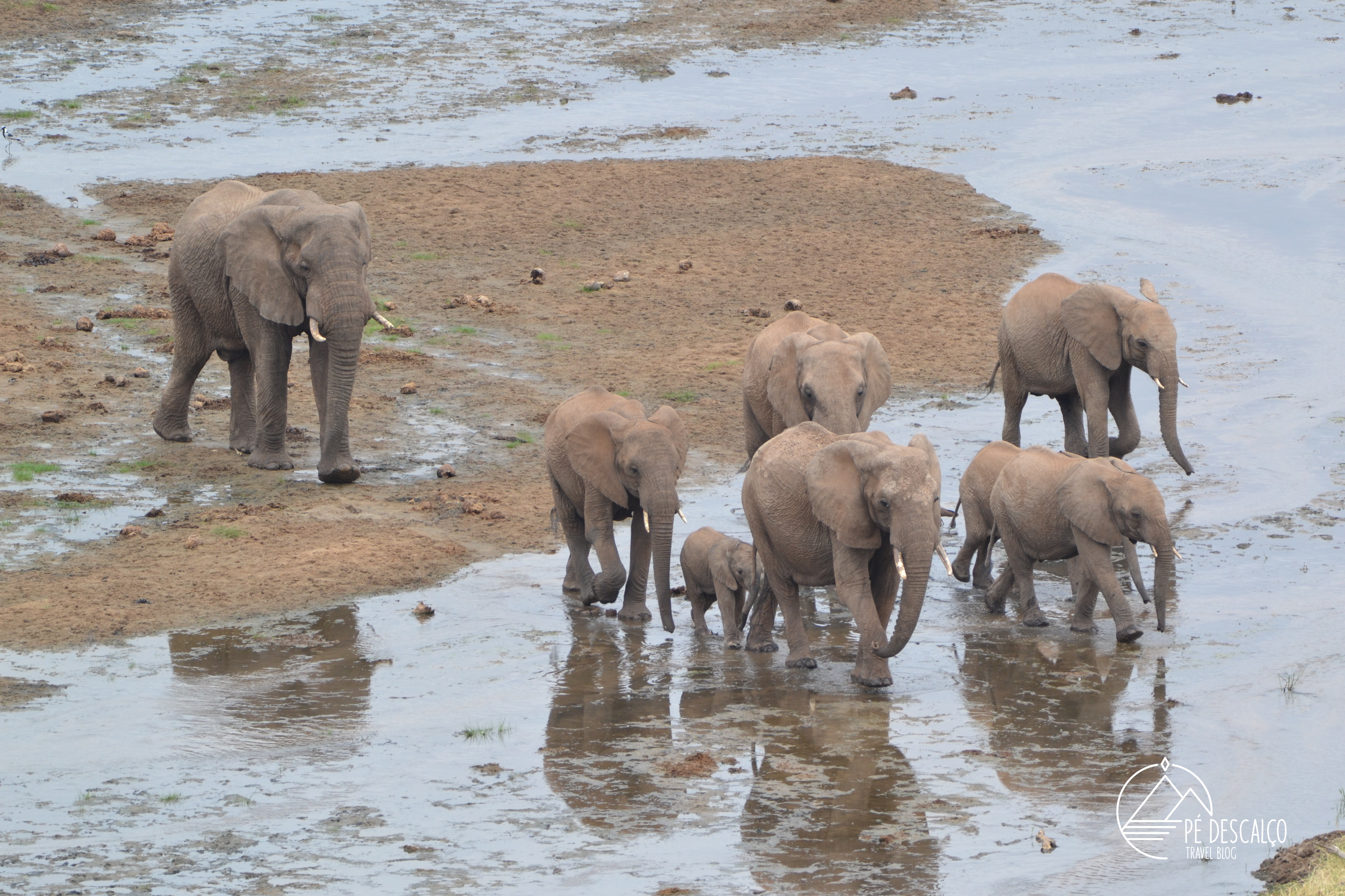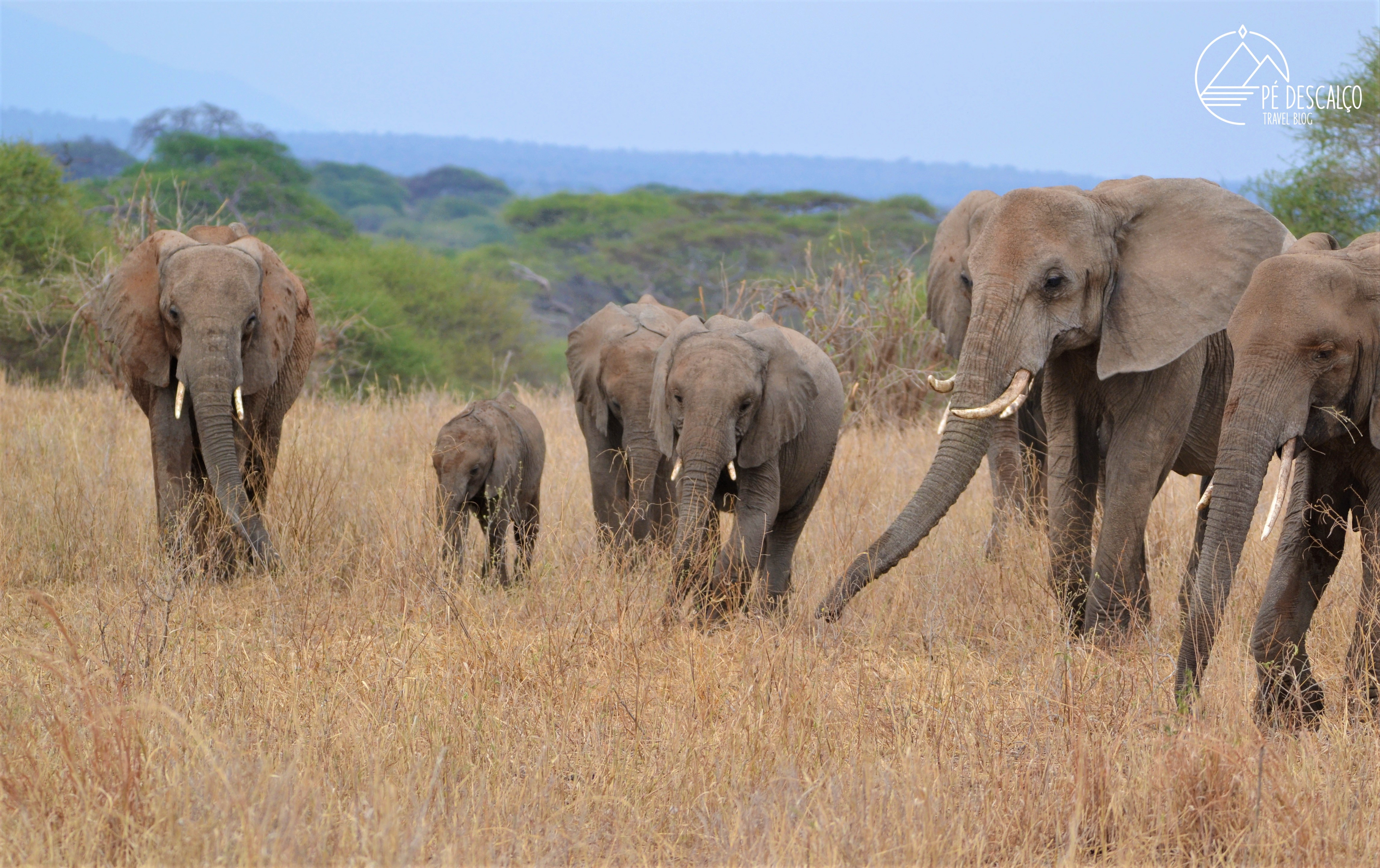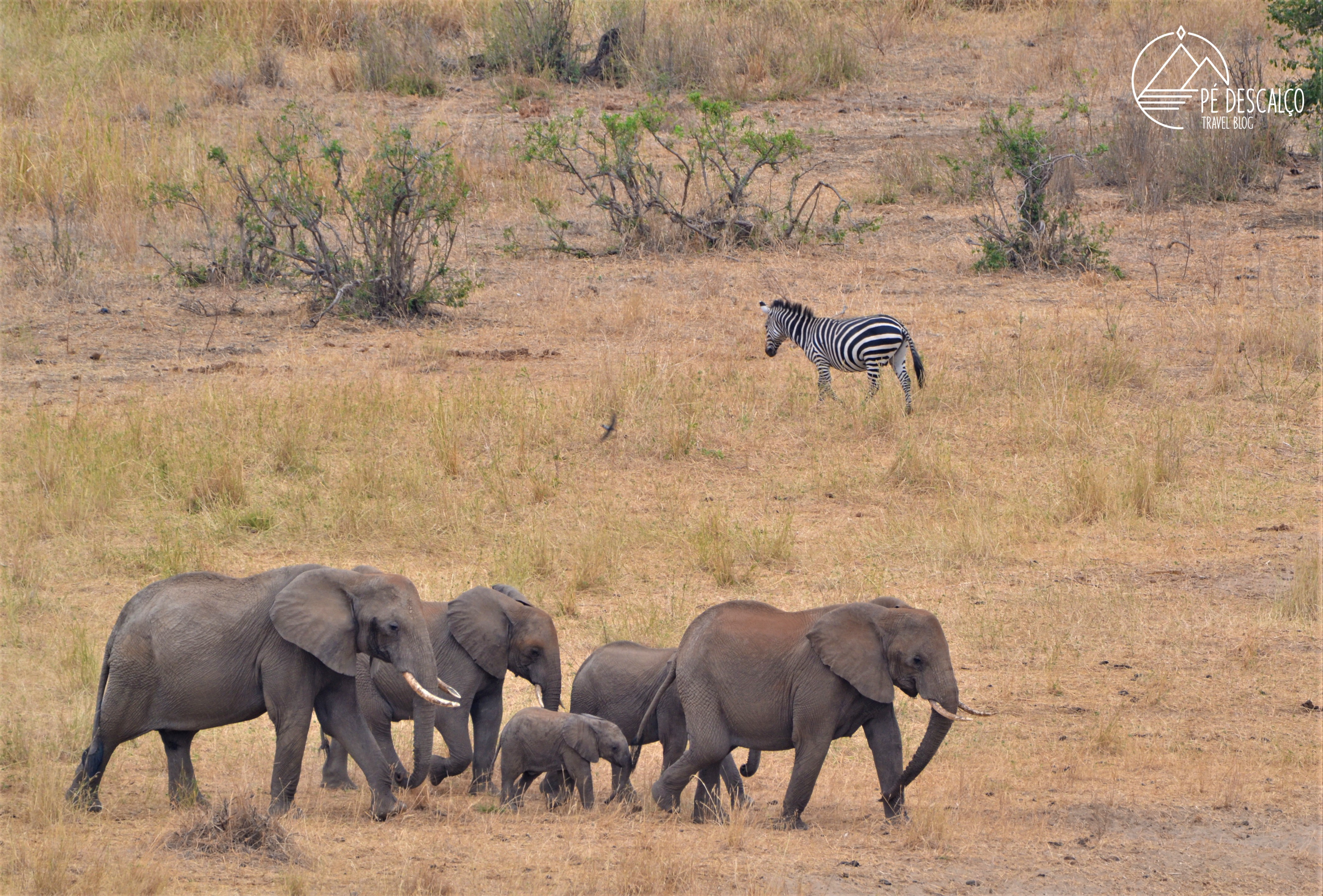 Depois de almoço seguimos viagem, continuando a explorar a savana em busca de qualquer animal que nos “quisesse cumprimentar”. O jeep do Saimoni seguia devagar e nós seguimos em pé e a espreitar pela abertura superior, expectantes por encontrar mais um animal. O olhar do Saimoni deslizava entre o lado esquerdo, o direito e a frente do jeep, parecia ter radar, pressentia os bichos a qualquer distância. Impressionante! E num instante, voltávamos a ver mais um animal: agora era uma família de elefantes que passeava por entre as folhas das árvores. Foi aqui que conseguimos observar em detalhe cada curva, cada ruga, o movimento das espessas patas ou das grandiosas orelhas. Que animal tão majestoso!