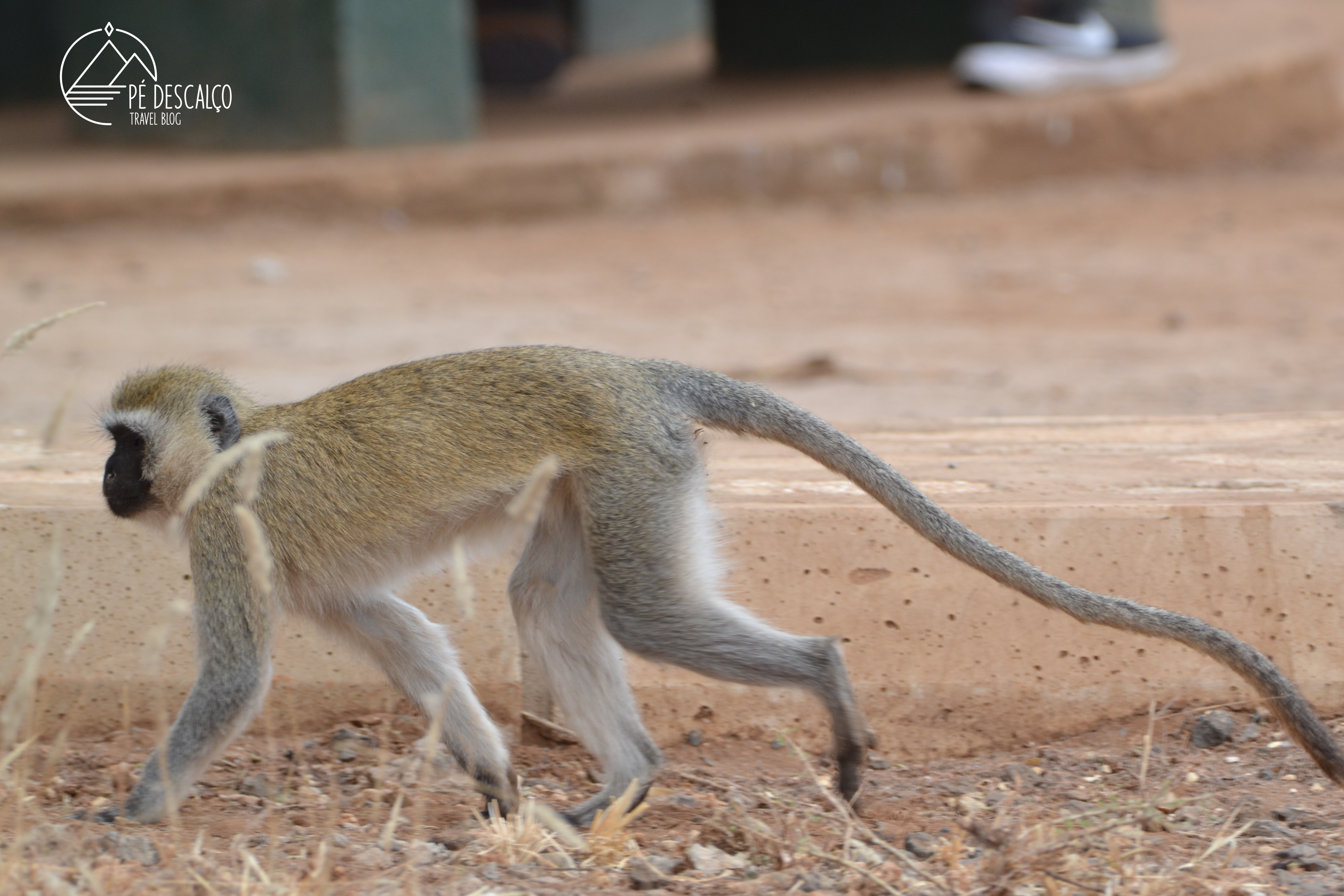 A hora do almoço aproximava-se a passos largos e o Saimoni encaminhou-nos para o parque de merendas onde iríamos almoçar, sim em plena savana, sem quaisquer vedações. Por ali já estavam estacionados uns 20 a 30 jeeps e uns quantos também estavam a chegar. Assim que pisamos o solo, a primeira sensação foi a de olhar para todos os lados e perceber que animais andavam por perto: naquele momento não avistámos nenhum. Embrenhámos pelo parque, onde já se encontravam outros grupos de pessoas, algumas que já almoçavam. Pouco depois encontrámos pequenos macacos que faziam a delícia das pessoas que por ali circulavam. Ariscos e sobranceiros iam roubando a comida das pessoas que por ali circulavam.