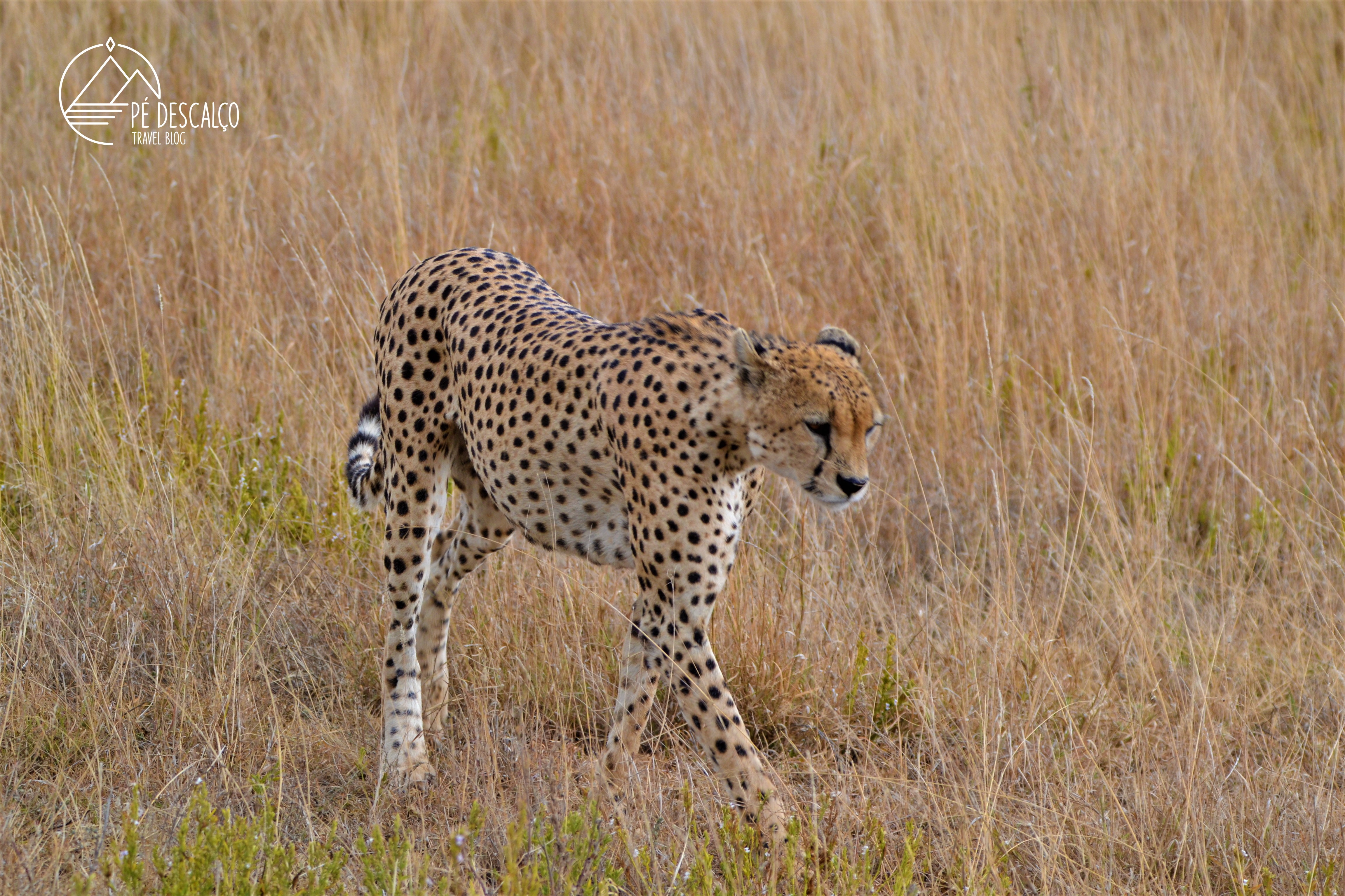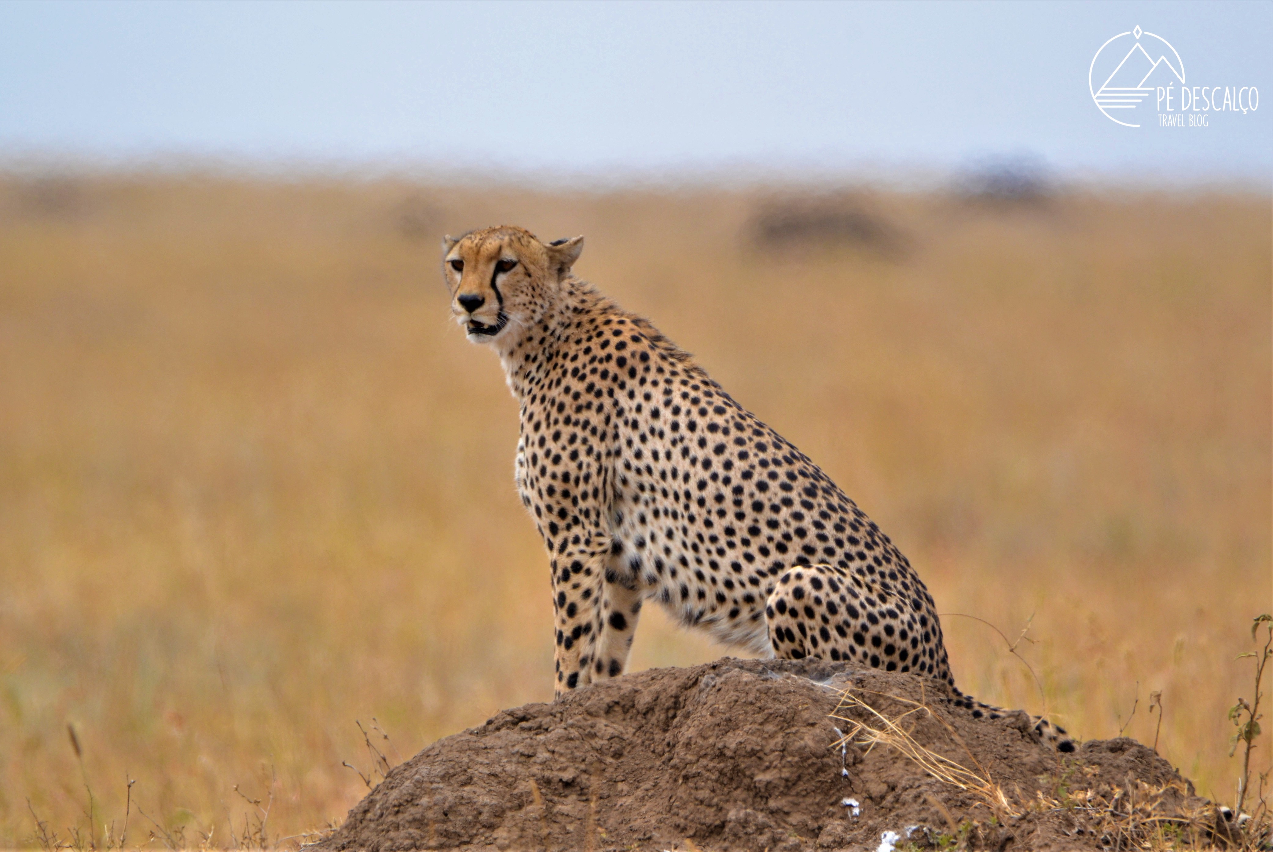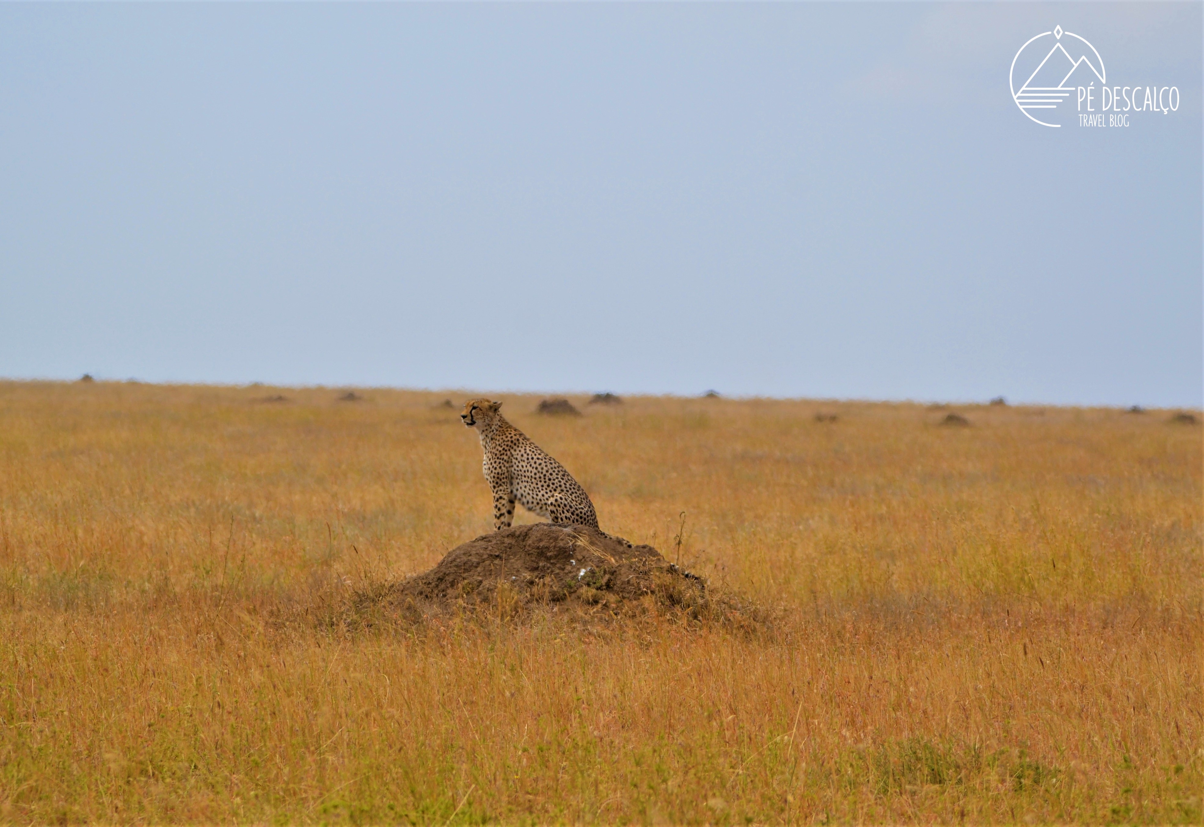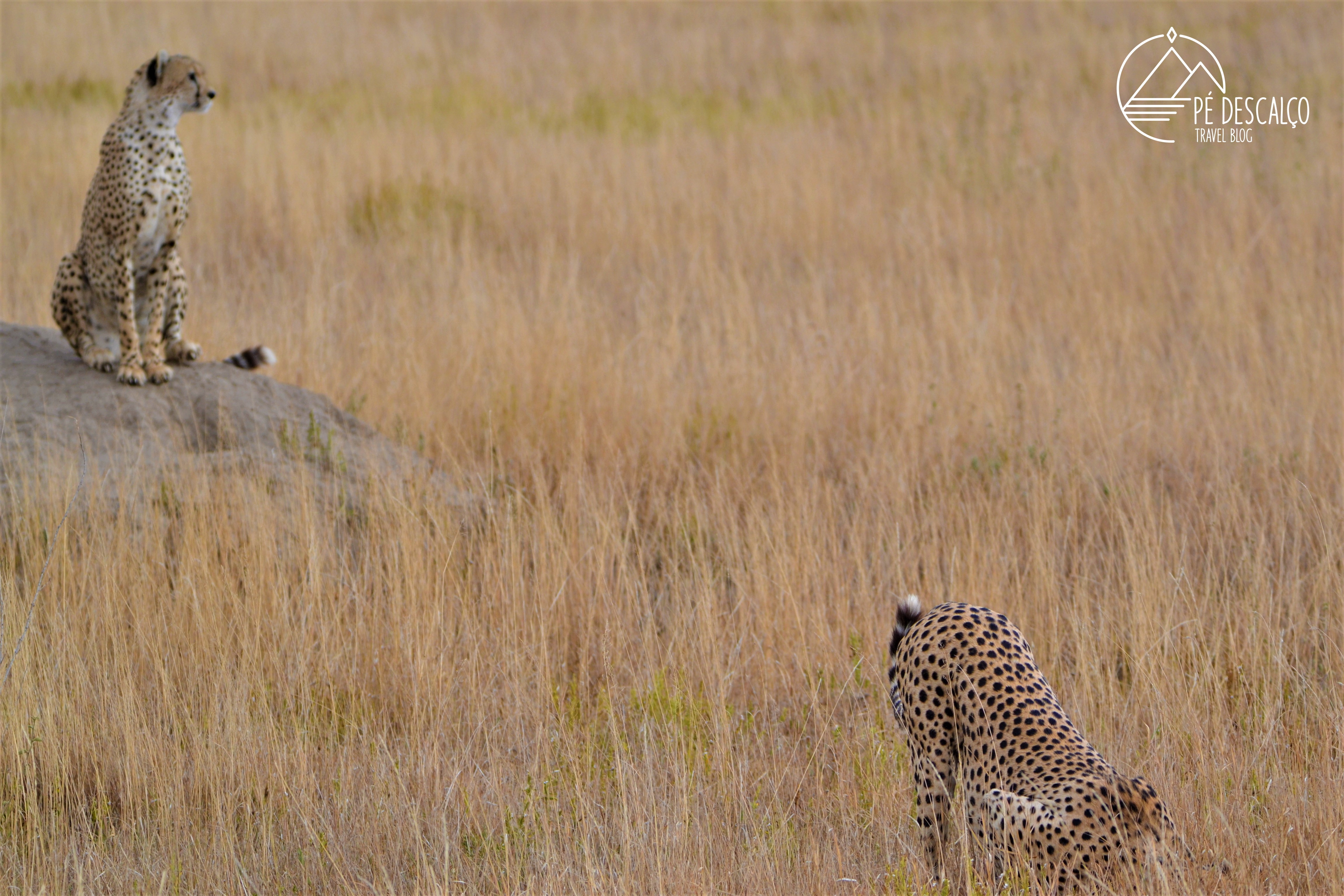 Eis que Saimoni volta a inverter a marcha noutra direção. Acelerou um bocadinho o jeep, mais do que era normal e, de repente começámos a ver outros jeeps parados e, de novo volta a abrandar. Ao lado dos jeeps, estavam duas chitas!!!! Wowww (mais uma vez)! Sustive respiração por uns breves instantes e em simultâneo senti o coração acelerar a batida. Era a primeira vez que estava a ver um felino no seu habitat natural e tão, mas tão perto. Enquanto observavam o horizonte, uma delas estava sentada em cima da pastagem rasteira e seca e a outra em cima de um morro de terra. Parecia que tinham “congelado”, nem deram pela nossa chegada. Estavam estáticas, sem pestanejar, apenas o diafragma oscilava. Que bichos incríveis, que elegância! Esperámos por vê-las partir na direção que tínhamos vindo. Seguimos na direção oposta, sem imaginarmos o que viria a seguir.