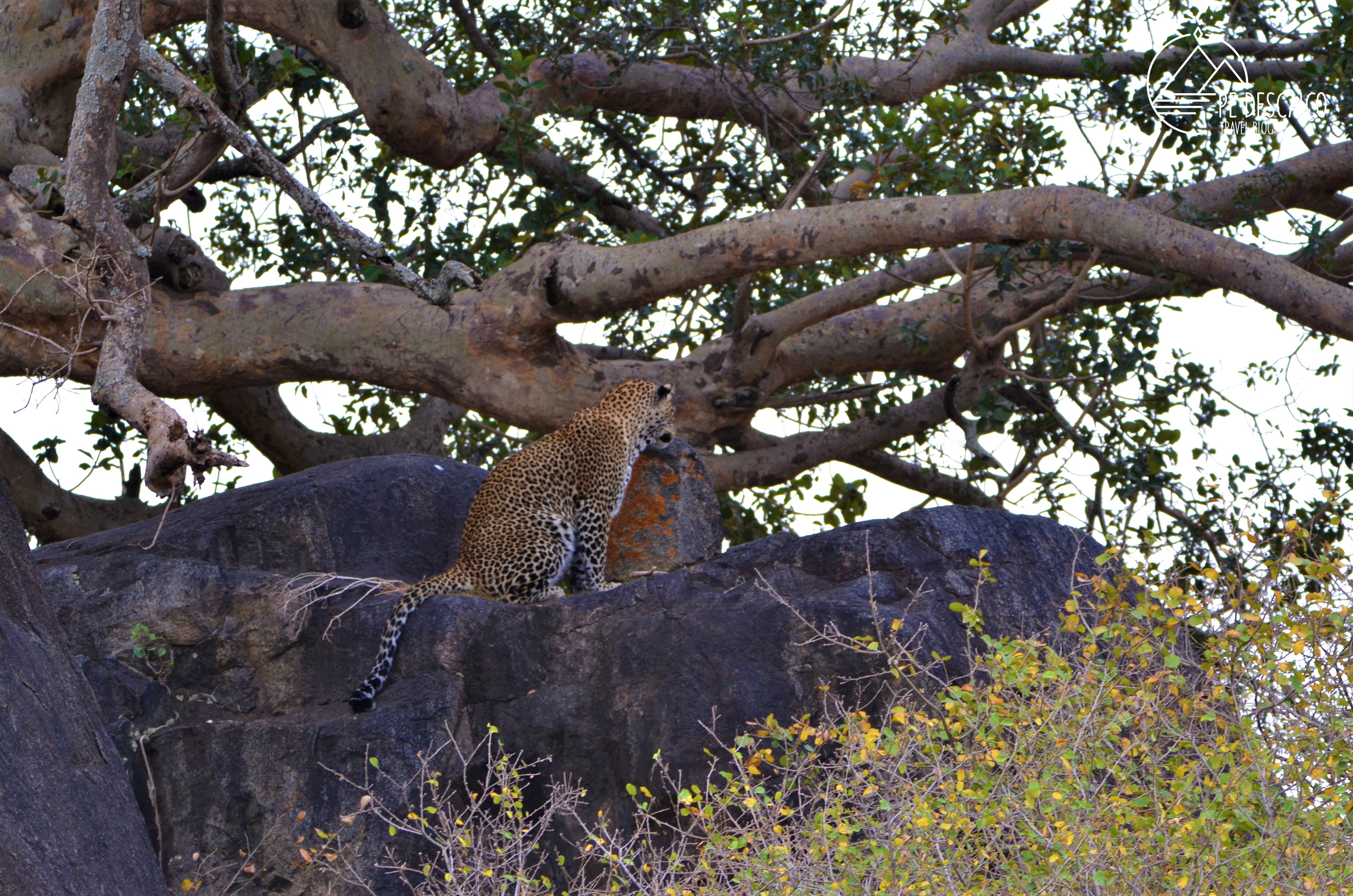 Ligou o jeep e pô-lo imediatamente em movimento e não demorou muito até encontrarmos um aglomerado de jeeps. Aprendêramos que: “onde estiverem muitos jeeps juntos, por ali há novidade”! E havia de facto! Era um leopardo! Dormia no quentinho de uma rocha, no topo de um morro rochoso. Estava longe, mas conseguíamos perceber os seus contornos e os seus movimentos. Aguardámos algum tempo até percebermos que não sairia dali tão cedo. Seguimos viagem.