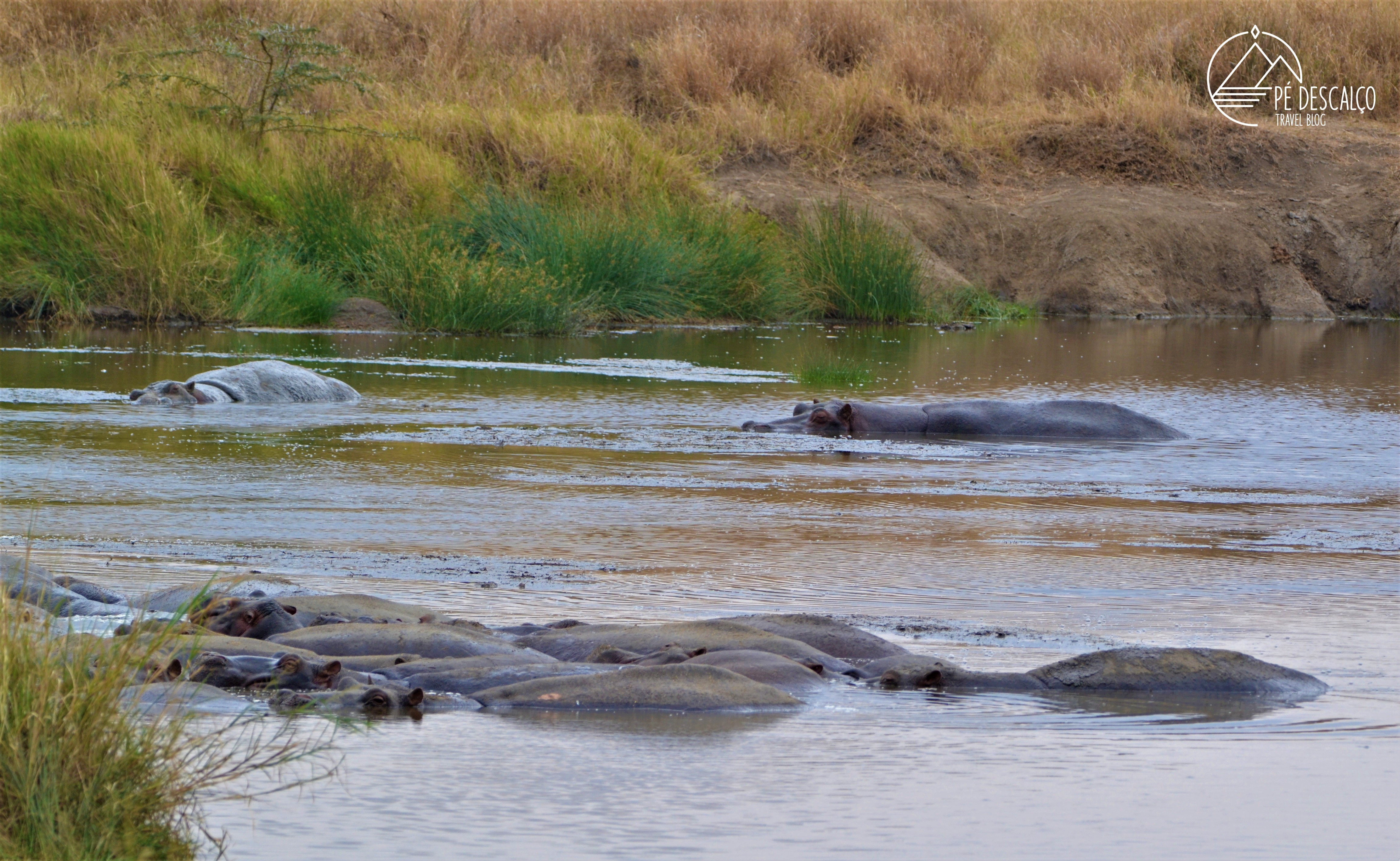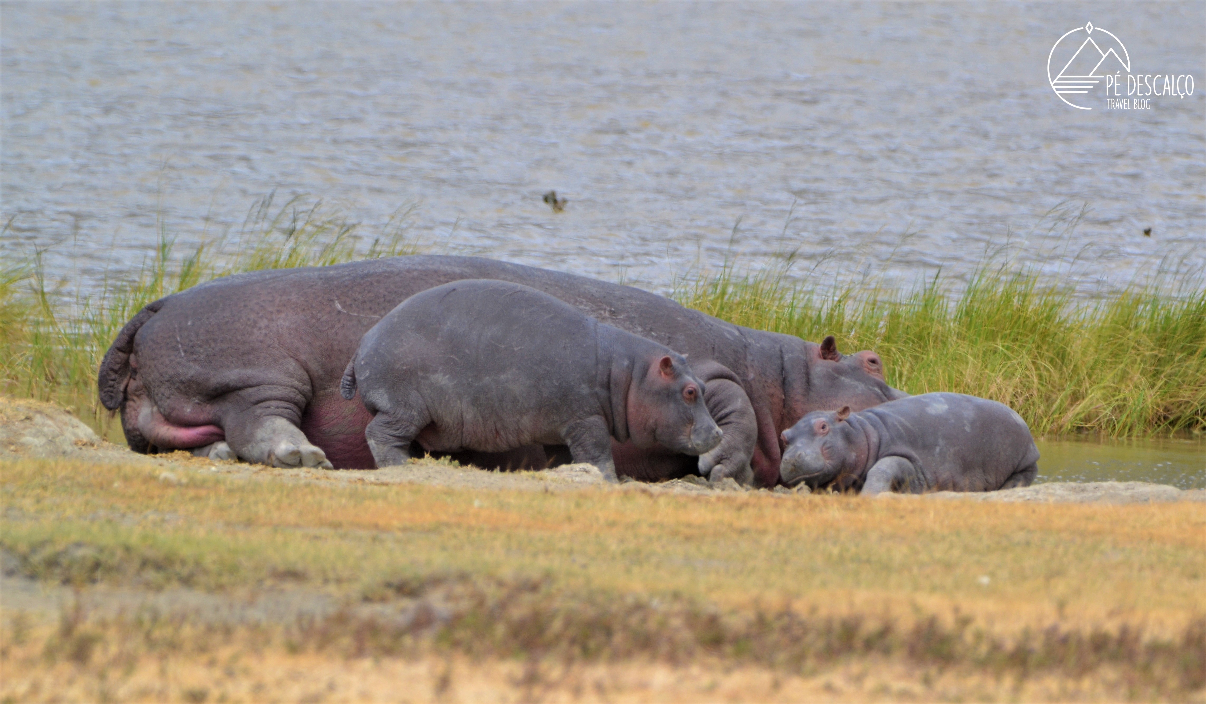 E eis que surgem mais alguns “tesouros”. Estávamos a chegar perto de um pequeno lago, quando começámos a ver mais 2 ou 3 jeeps estacionados junto à sua margem. Mais uma vez, algo estava a acontecer! Naquele lago estava uma comunidade de hipopótamos que desfrutavam do lago. Na margem, um crocodilo adulto observava as suas movimentações ou, quem sabe, se aguardava a chegada de alguma outra presa mais apetitosa.
