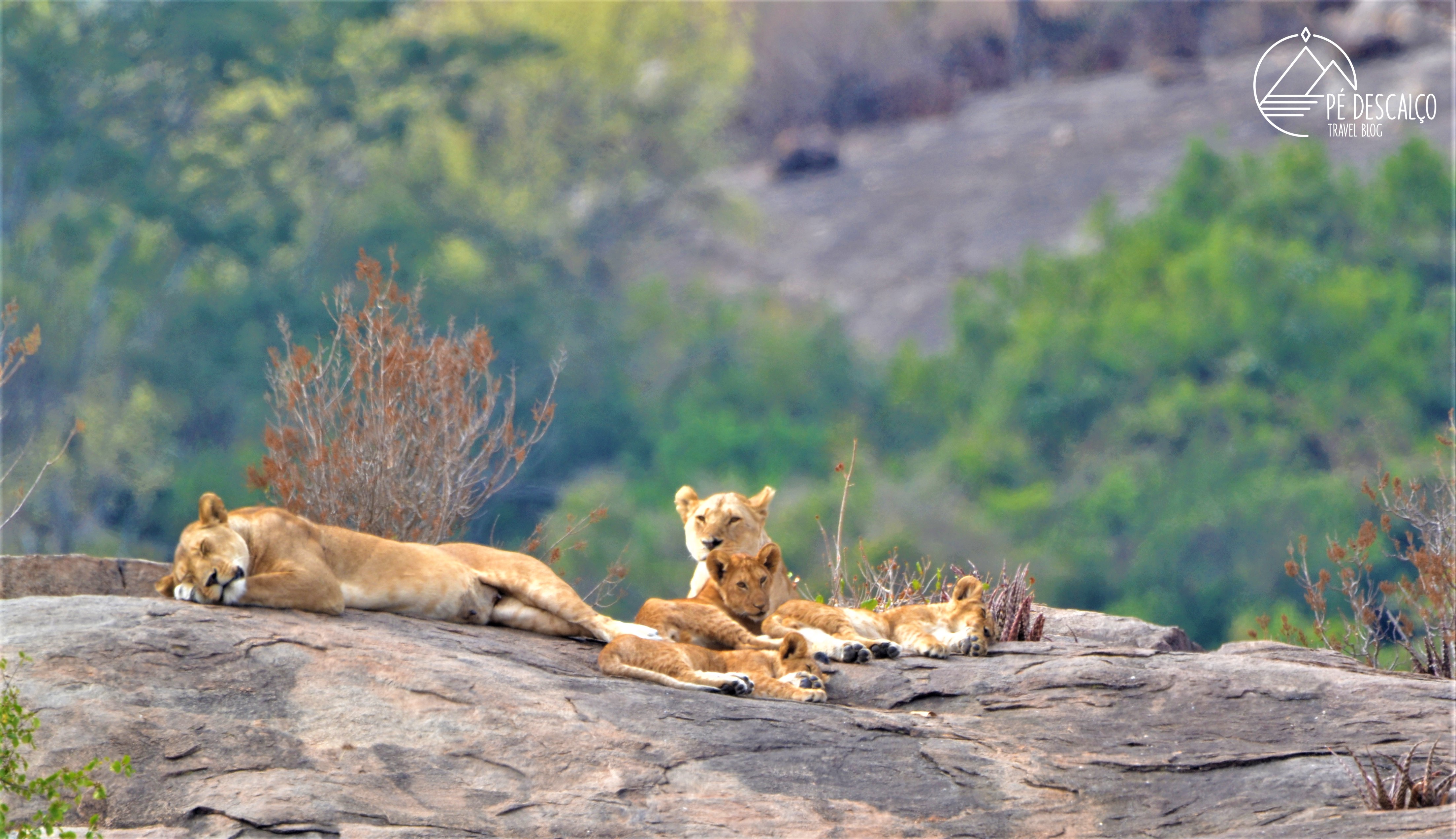 O Saimoni acelerou novamente o jeep na direção de outro morro rochoso. Contornou-o pela direita e, sem ainda termos recuperado do que acabáramos de viver, surge uma ninhada de 3 leões, a menos de 3 metros de distância. Estavam sozinhos, a mãe terá ido buscar alimento, mas estaria por perto e poderia aparecer a qualquer momento. Não era possível! Ainda não tínhamos recuperado do que acabáramos de viver e estávamos novamente com as respirações aceleradas. Quando o Saimoni nos perguntou no início desta viagem que animais gostávamos de ver, jamais imaginámos que pudesse ser possível ver felinos tão pequeninos. Emocionámo-nos, não havia como não acontecer… Que emoção, que sensação maravilhosa! Agradecemos cada segundo pela oportunidade que a vida nos estava a dar! O Saimoni percebeu que queríamos ficar ali, só a observar. E estivemos ali, apenas nós, sem mais jeeps nas redondezas algum tempo. Tempo precioso!