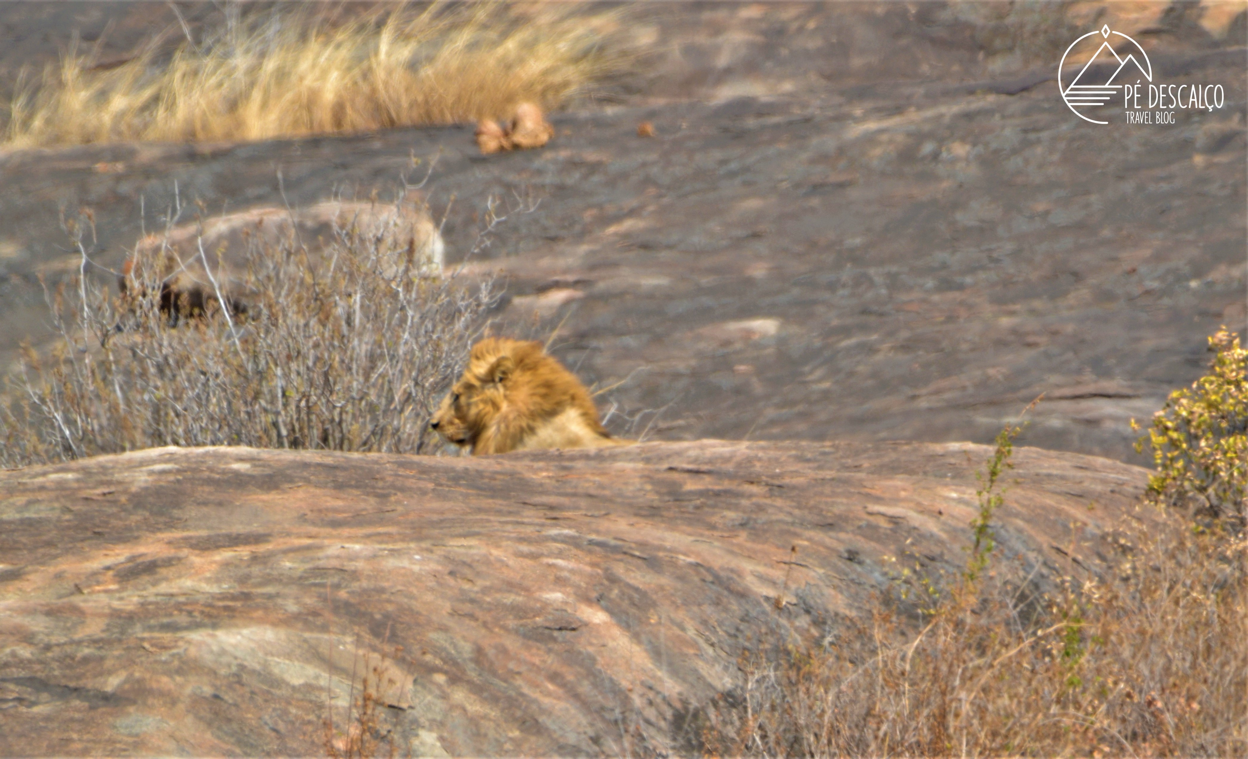 O jeep enveredou por caminhos cujas paisagens eram ainda mais intermináveis. Os amontoados de rochas ou, por outras palavras, a “casa dos leões” eram de novo visíveis. Os nossos olhos “rasgavam” as planícies em busca de um animal e andámos seguramente uma hora sem vislumbrar qualquer um. É bastante cansativo, mas nada nos fazia desviar os olhares daquelas paisagens. Tanto eu como o Magno percebemos o porquê: estávamos claramente em terreno felino e por isso a ausência de tantos animais. O Saimoni começava a centrar a sua atenção mais junto aos rochedos: era aí que provavelmente estariam. E, novamente, desligou o jeep, puxou dos seus binóculos sob a nossa direção esquerda. Percebi que ali estava algo. Eu não consegui ver nada, mas, o Magno sim! “Uma enorme família de felinos!” Bingo! Eram os primeiros leões adultos que estávamos a ver em ambiente selvagem! Maravilhoso! Uma vez mais, tive que utilizar a lente da camara fotográfica para poder vê-los. Eram pelo menos 3 leoas, rodeadas por aquelas que seriam as suas crias, com 3 ou 4 meses de idade. Inicialmente, quando os vimos, só conseguimos ver-lhes pouco mais do que as orelhas, mas o Saimoni voltou a ligar o jeep, avançou um bocadinho, procurando um melhor vislumbre, e et voilà! Wowww, conseguíamos vê-los quase na perfeição. Deram pela nossa presença: alguns deles levantaram a cabeça na nossa direção, algumas crias levantaram-se curiosas e começaram a descer ligeiramente o rochedo, sob o olhar atento daquelas que seriam as mães. Mas não passou de uns curtos passos porque logo voltaram a deitar-se no provável quente da rocha. Era um cenário maravilhoso, um quadro fabuloso!