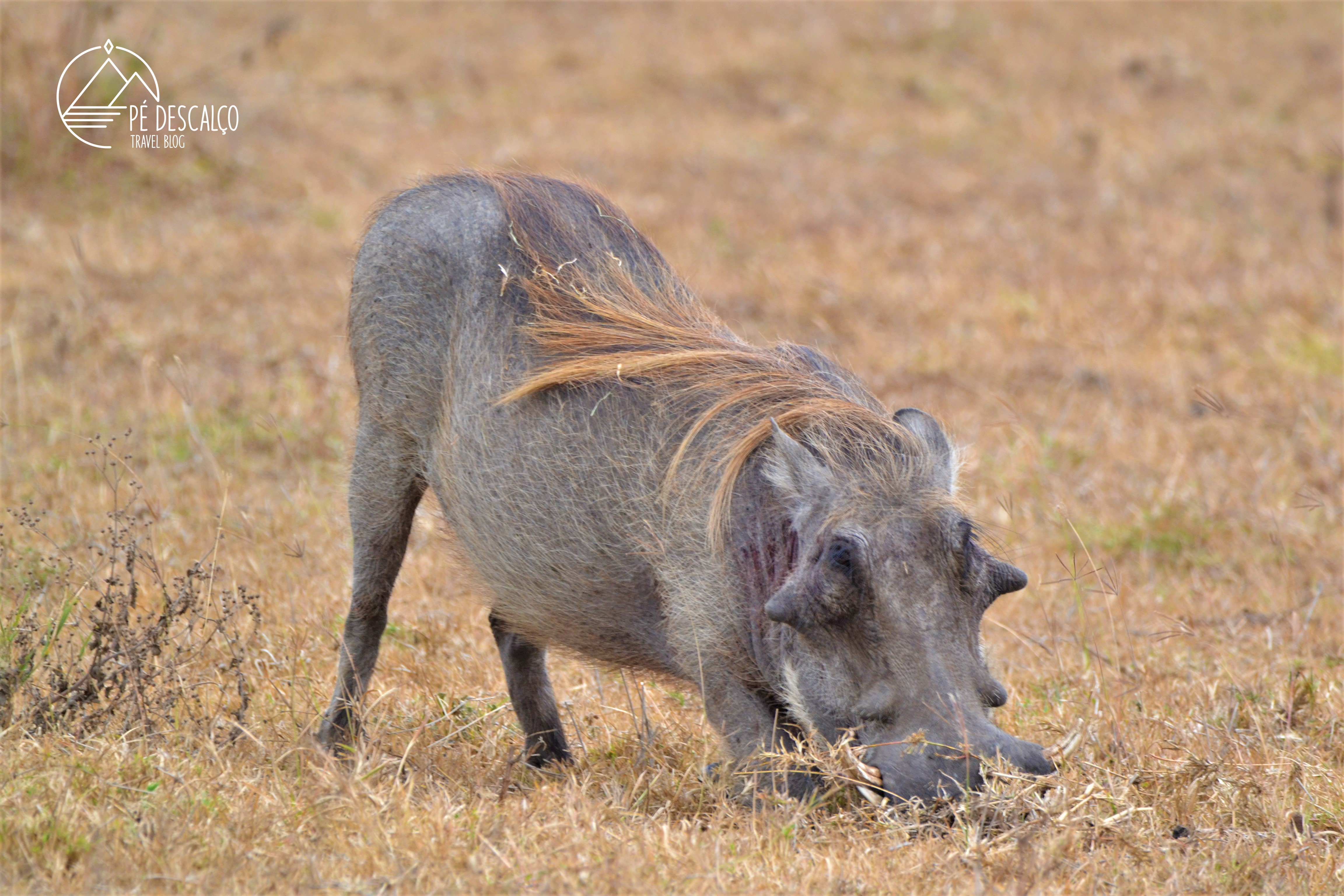 O primeiro animal a “cumprimentar-nos” foi um impala macho, que surgiu ainda não tínhamos andado 200 metros. A seguir uma pequena família de gazelas e 2 javalis. Poucos metros depois, vimos a primeira girafa e o primeiro elefante. Ambos estavam a cerca de 300 metros e envoltos em arvoredo, por isso a sua visualização não era maravilhosa. Ok, sem problema, tínhamos a certeza de que não iríamos embora dali sem os voltarmos a ver! Mais uns metros à frente e eis as zebras e gnus. Wow (mais um wow) e estas estavam TÃO perto! Deslocavam-se em família para o interior da savana e na diagonal, permitindo que o jeep deslizasse devagarinho que quase as conseguíamos tocar. Estávamos rendidos e ainda só tínhamos 20 minutos desde que tínhamos entrado no parque.