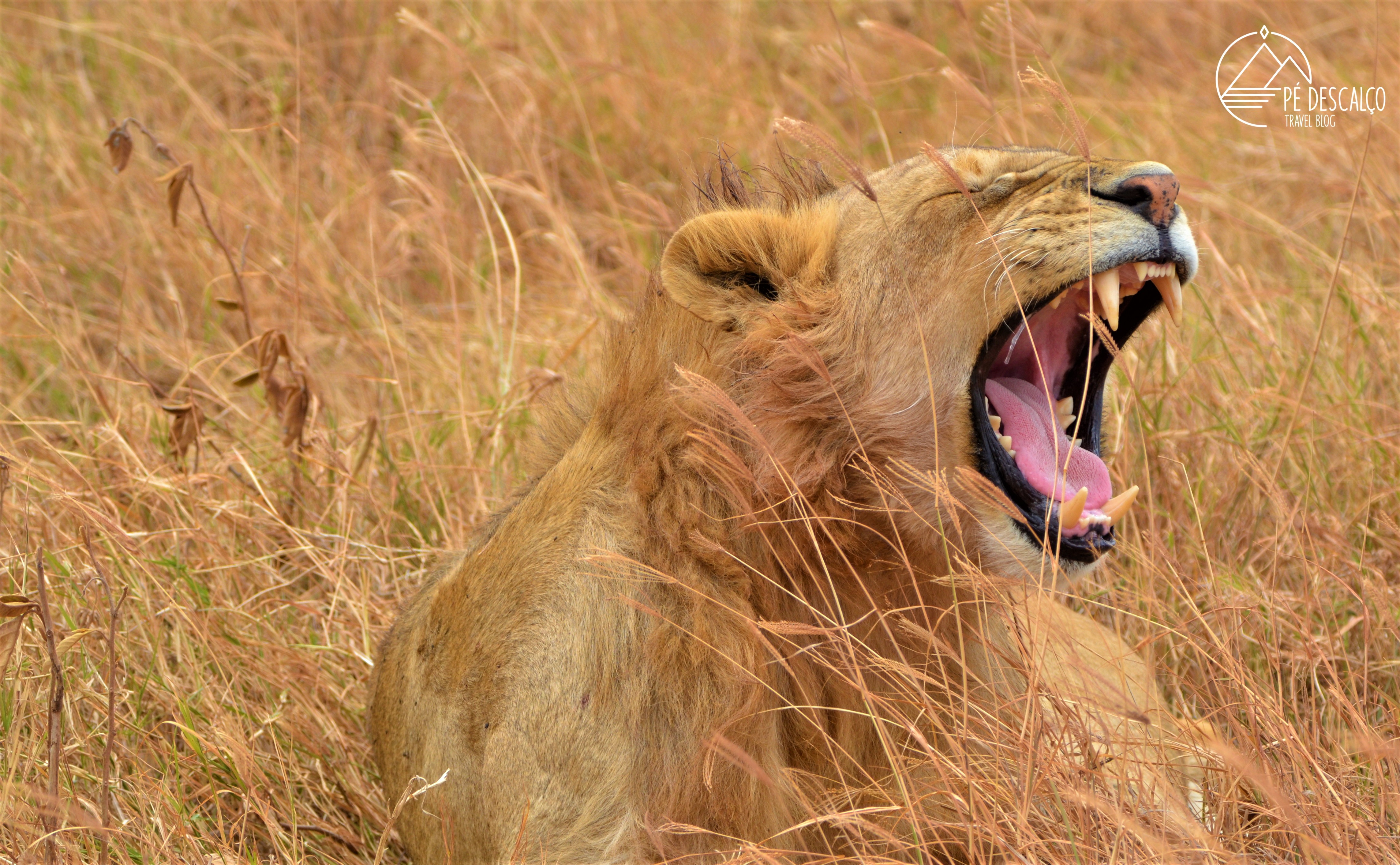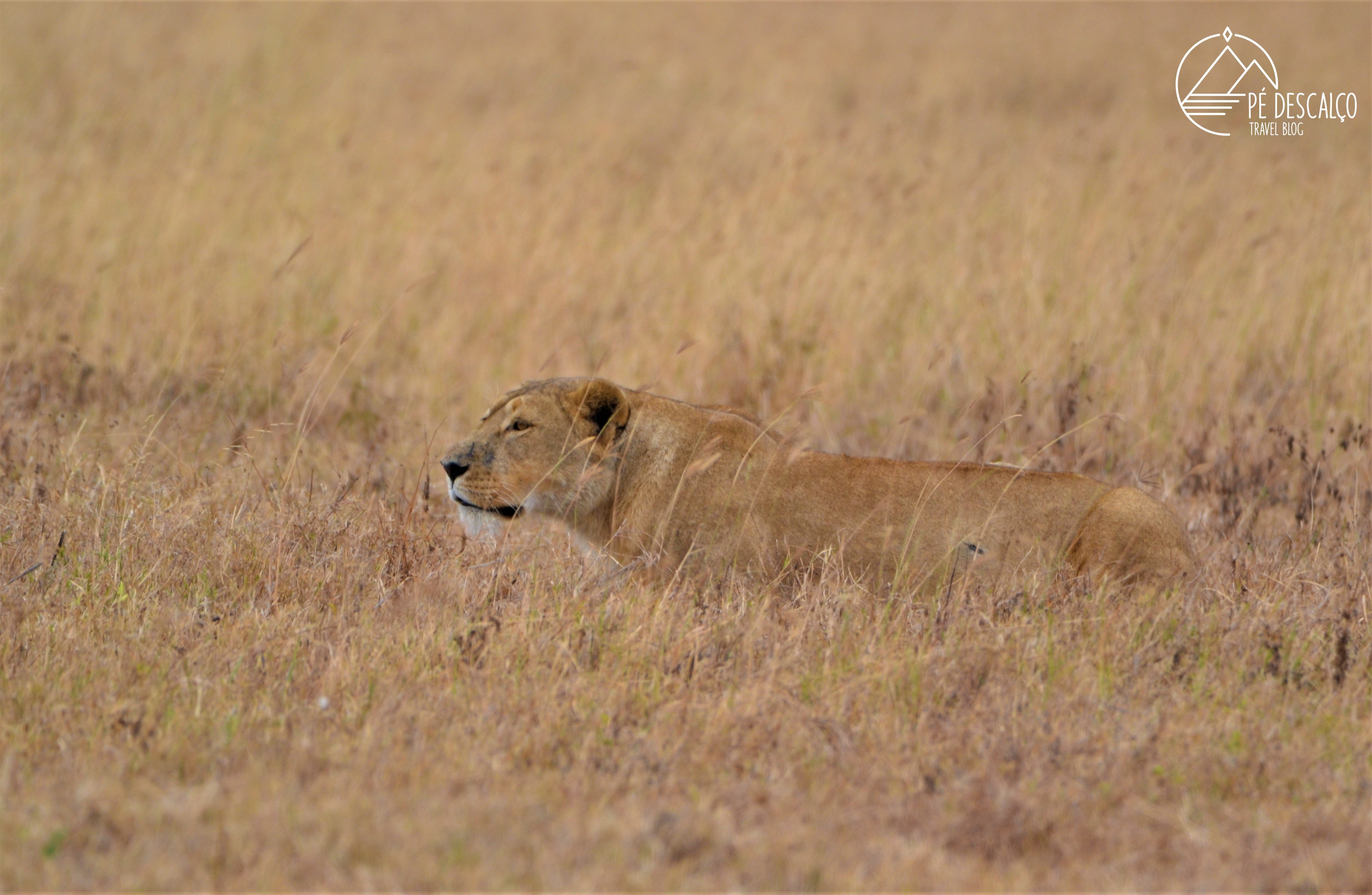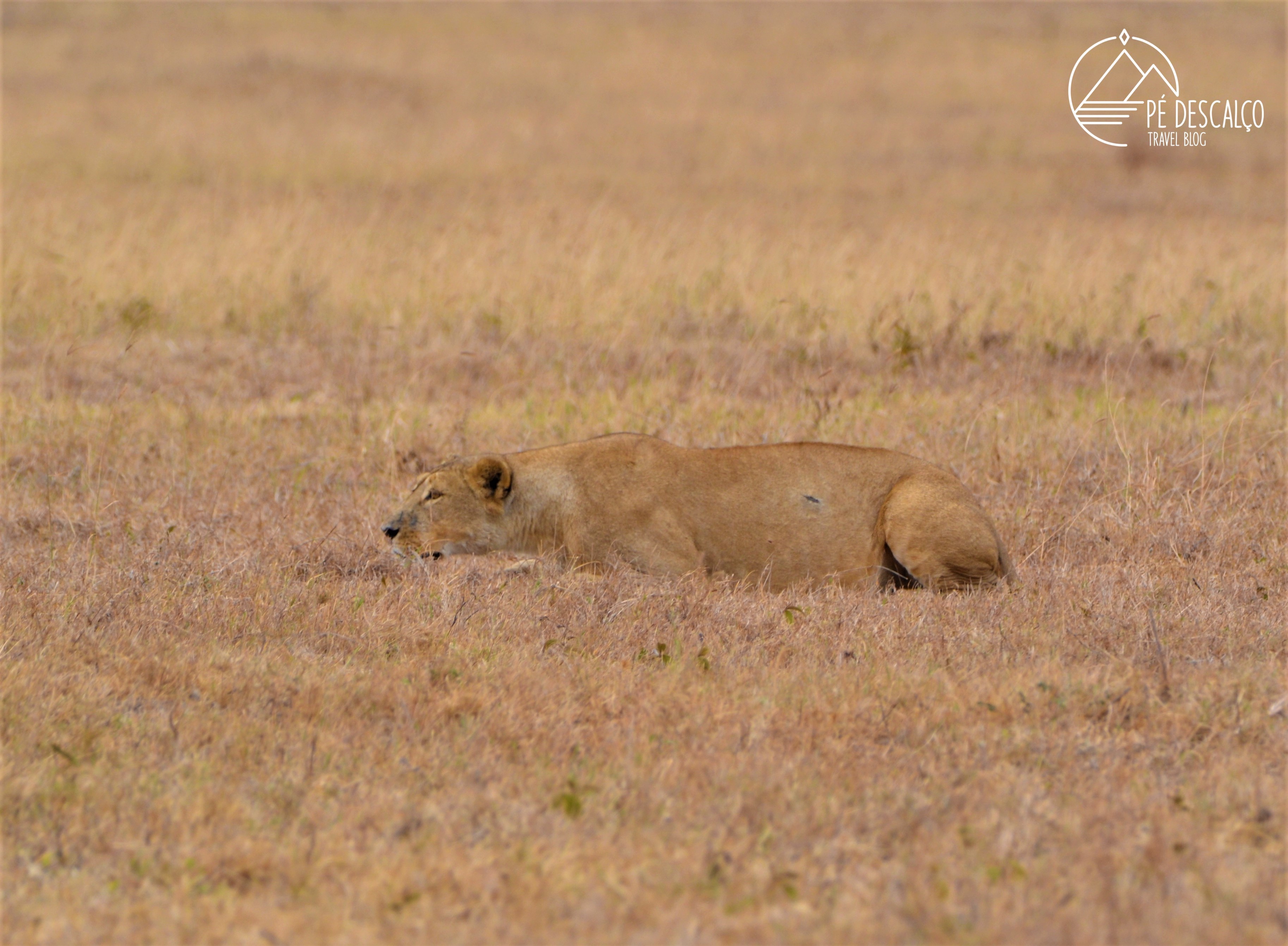 Vimos uns 4 jeeps encostados e com os motores desligados. As pessoas estavam voltadas para o lado direito, observando a vegetação aí existente. Não percebemos o que se passava, quando o Saimoni diz-nos: “it’s a young lion“. Wowww… Era o primeiro leão que íamos ver! O Saimoni aproximou-se mais, encostou o jeep e desligou-o. A localização era boa, mas o jovem leão estava a dormir no meio da vegetação seca, que era da sua cor. Só conseguíamos ver-lhe as orelhas. Ainda esperámos um bocadinho, na esperança de que se levantasse, mas não aconteceu, pelo menos enquanto alí estivemos. Por isso, acabámos por seguir viagem.