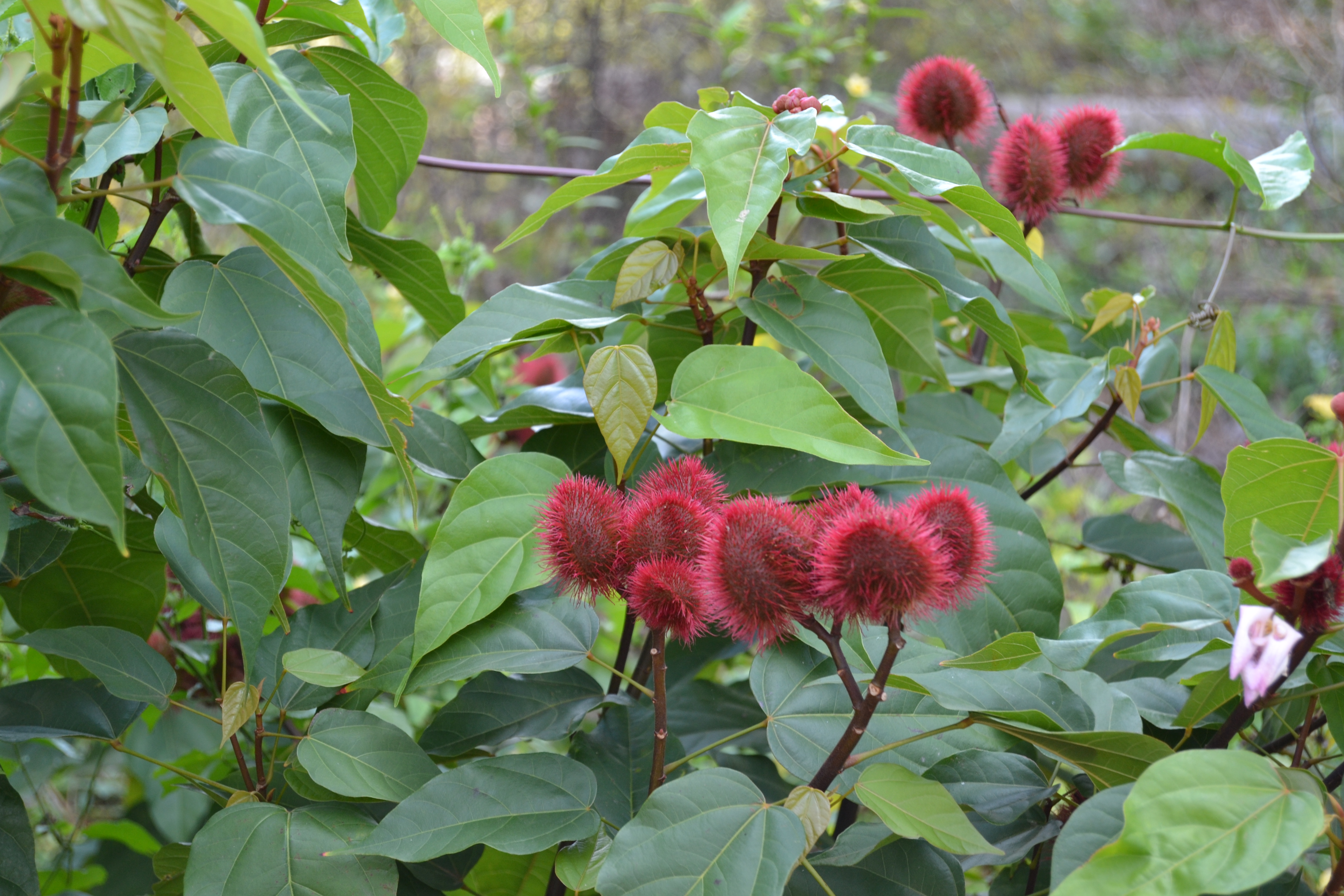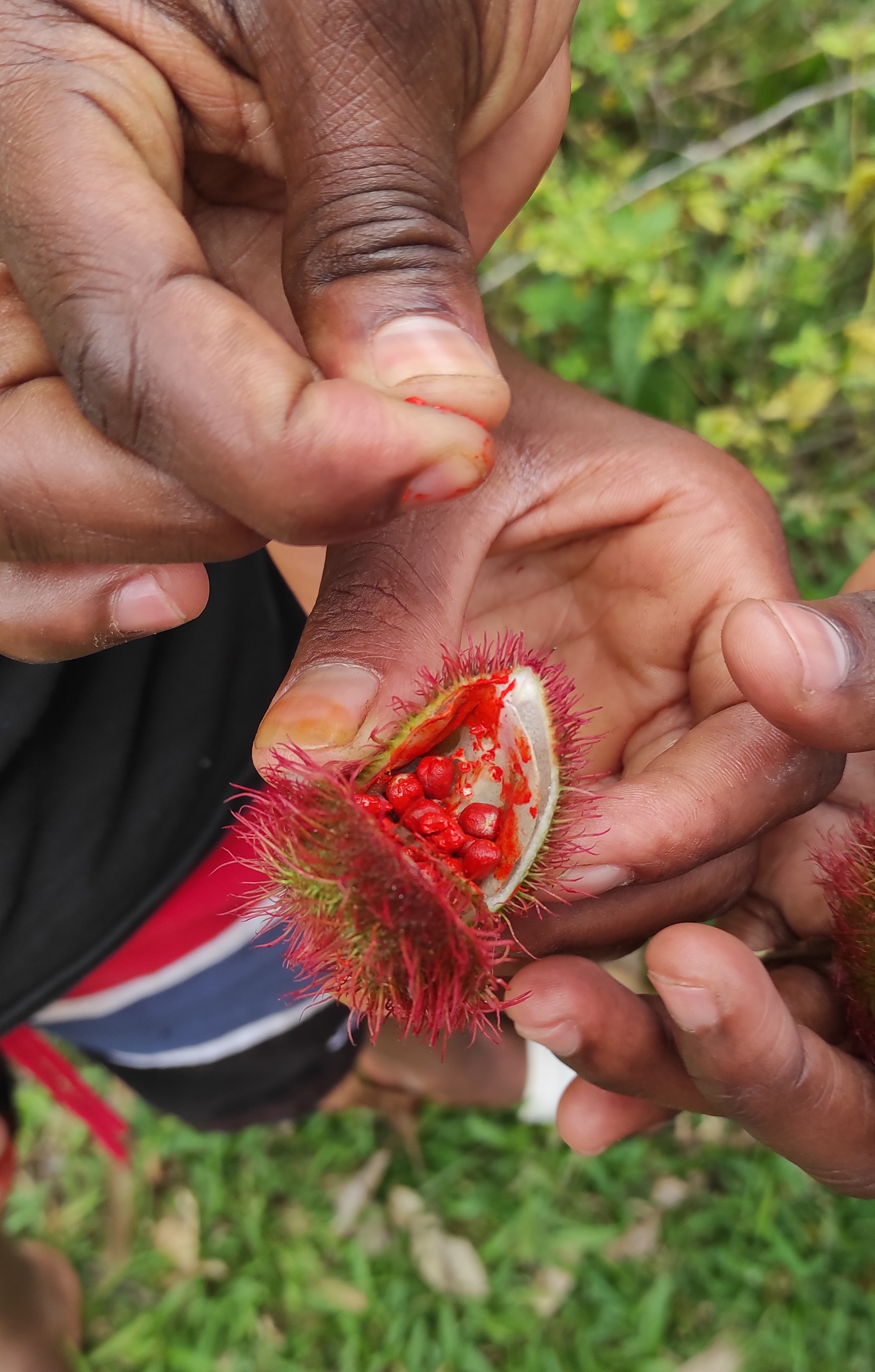 Embrenhamos no interior da plantação e fomos tentando descobrir cada especiaria que nos iam apresentando, à medida que nos iam explicando a sua origem e os cuidados para cultivo. A “pinta lábios”, proveniente da planta Bixa orellana, foi a primeira a ser apresentada. Trata-se de um fruto vermelho com imensos fins, dois deles são por exemplo um dos compostos do bâton ou do verniz para as unhas.