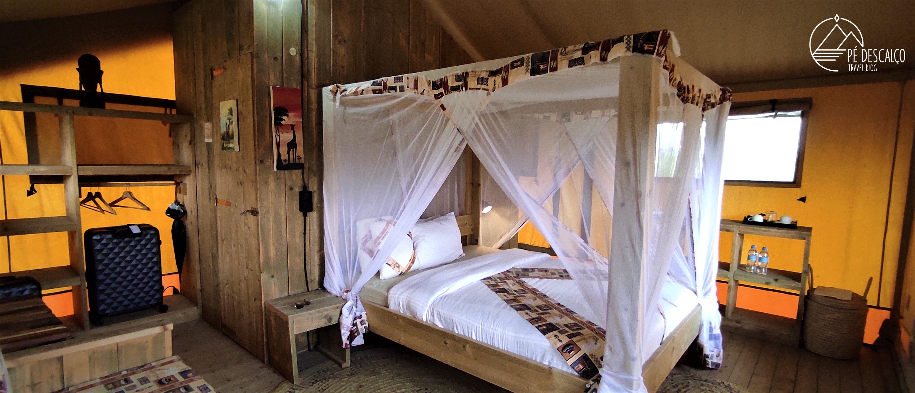 O nosso segurança aguardava por nós na receção, pronto para nos levar ao nosso quarto. Estava tão escuro, que nem as lanternas permitiam ver além dos 2 metros de distância. A menos de 50 metros do nosso quarto, o segurança parou. De novo! O que se passava agora? Apontou as duas lanternas (a da cabeça e a que levava na mão) em direção à vegetação seca que estava do nosso lado direito. Ficámos ali parados uns 10 segundos, que novamente me pareceram uma eternidade. Nada! Não vimos nada, de qualquer forma o segurança terá detetado algo, que provavelmente se terá afastado. Continuámos o percurso em silêncio e cerca de 1 minuto depois estávamos a entrar na tenda. Mas não sem antes o segurança nos informar de que provavelmente iríamos dormir com as gazelas e os impalas debaixo da tenda. Era ali que se sentiam seguros, quentes, confortáveis. Portanto, era muito provável que de manhã tivéssemos companhia. À semelhança da noite anterior, dormimos com a sensação de que tínhamos um animal bem coladinho à lona da tenda e, muitas vezes, a passear no deck do nosso quarto. Os sons que escutámos, sobretudo ao amanhecer, são inesquecíveis e guardaremos nas nossas memórias o resto da vida. Mais uma vez, do interior da tenda tentávamos perceber que tipo de animal estaria ali. Com isto, até parece que não conseguimos dormir, mas não é verdade. De facto, o descanso não é o mesmo, pela adrenalina e curiosidade ao qual somos sujeitos, mas a experiência é inesquecível.