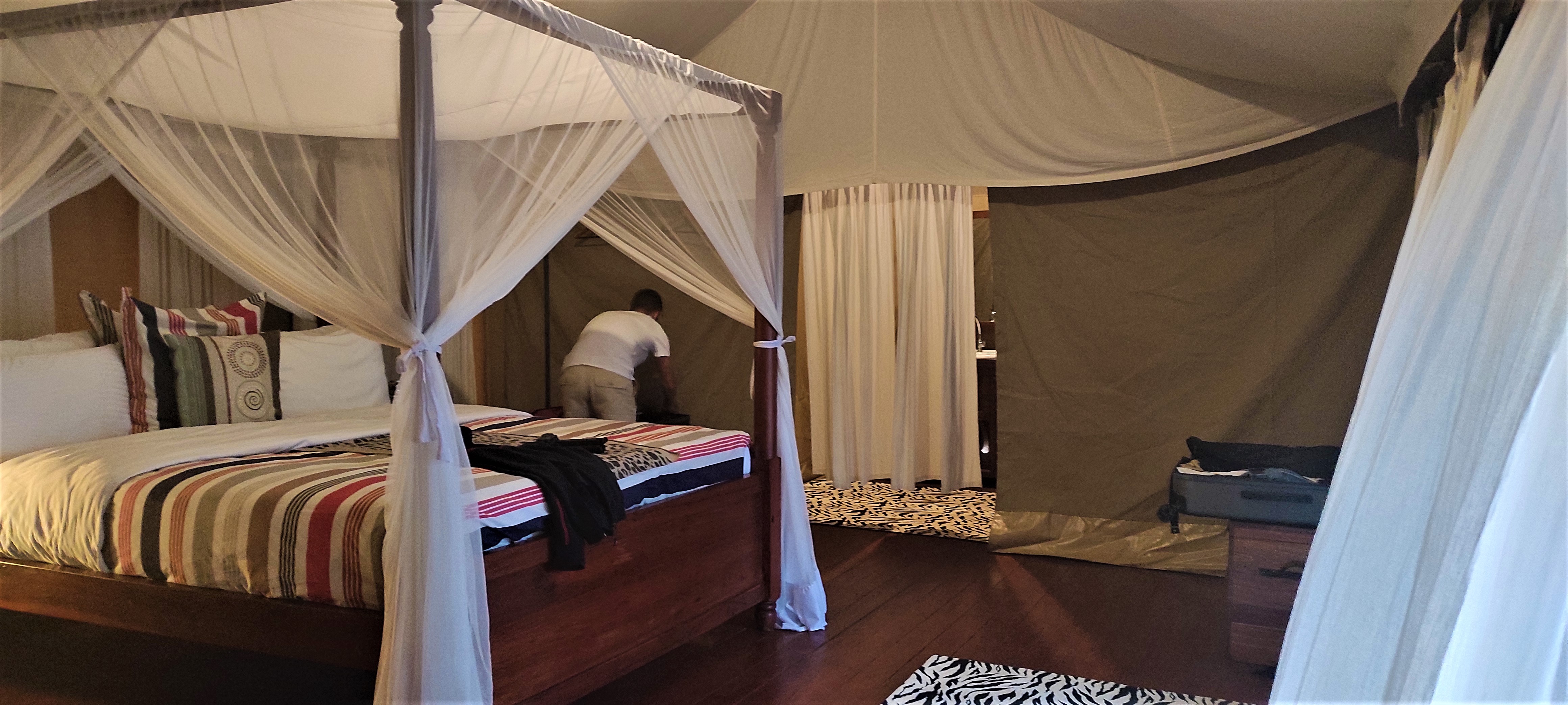 O segurança levou-nos ao nosso quarto. Por ali circulavam zebras, impalas, gazelas e, ainda que bastante mais afastados, babuínos. O segurança quis gentilmente carregar a nossa bagagem naquele piso irregular e que grata lhe fiquei! Verdade: era um trilho elaborado a partir da vegetação seca cortada e pisada, que abria percursos para cada quarto. O nosso era o último, o que ficava mais longe e na extremidade do alojamento. Chamava-se Acacia e, na realidade, não era um quarto, ou um bungalow, era uma tenda, cujas paredes eram em lona! Assustador? Não, mas, depois do que nos disseram na receção, estávamos céticos quanto à sua segurança. Valeu-nos a logística de ter que planear 2 banhos!
