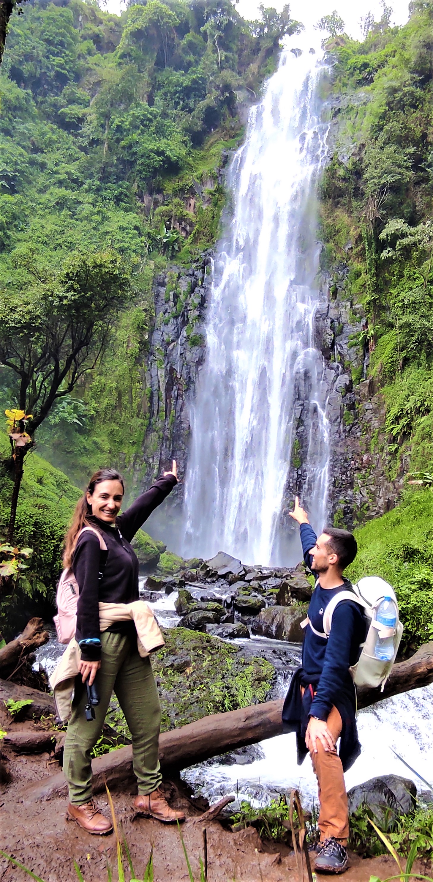 Cerca de duas horas depois, as cascatas eram evidentes. A “monstruosa” queda de água tem cerca de 200 metros de altura e está localizada a 1800 metros de altura, muito longe dos 5895 metros, a altitude máxima da montanha do Kilimanjaro. A humidade tornara-se significativamente maior e provocara uma nuvem de gotículas de água no local. Aquele cenário era incrivelmente arrebatador de tanta beleza. Na base da cascata formava-se uma enorme piscina que fez-nos pensar num eventual mergulho e só não o fizemos porque pensámos no trajeto de regresso e do frio que iriamos sentir. Mesmo assim, houveram alguns corajosos que o fizeram.