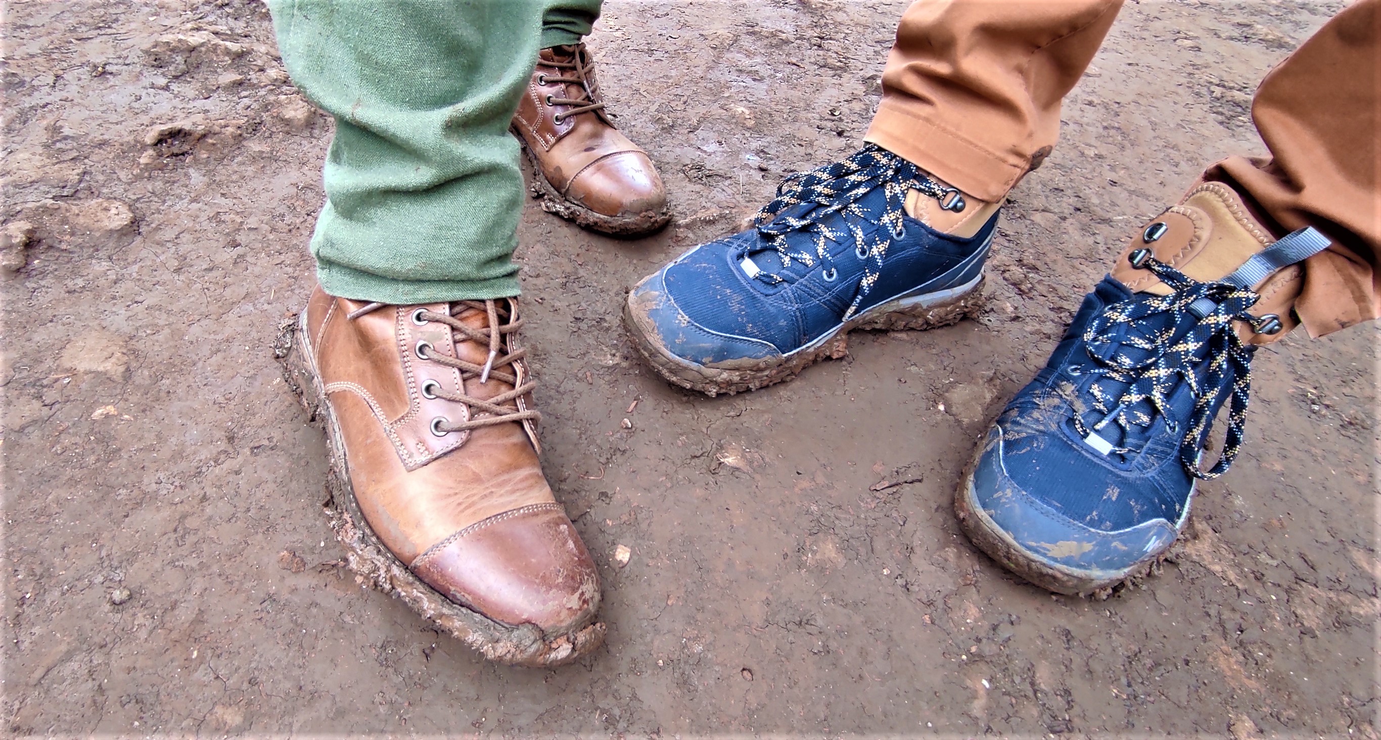 Era hora de almoçar e o almoço também seria por ali com a comunidade local, mas não sabíamos exatamente em que “formato”. Além disso, estava também previsto ver a plantação de café e bananas. Posto isto, o nosso guia perguntou-nos se queríamos almoçar ou ir às plantações. Como estávamos famintos, pedimos para almoçar primeiro. E assim foi. Descemos uma pequena colina e entrámos naquilo que nos pareceu ser o terreno de uma casa privada. O nosso calçado estava bastante enlameado, ao ponto de ficarem colados ao chão. Como íamos a comentar com o nosso motorista que, na viagem de regresso, teríamos que ir no tejadilho do carro, para não o sujar, quando chegámos ao local onde íamos almoçar, lá estava um rapaz com 2 pares de “crocs”. Amavelmente foram limpar-nos o calçado, que veio como novo!