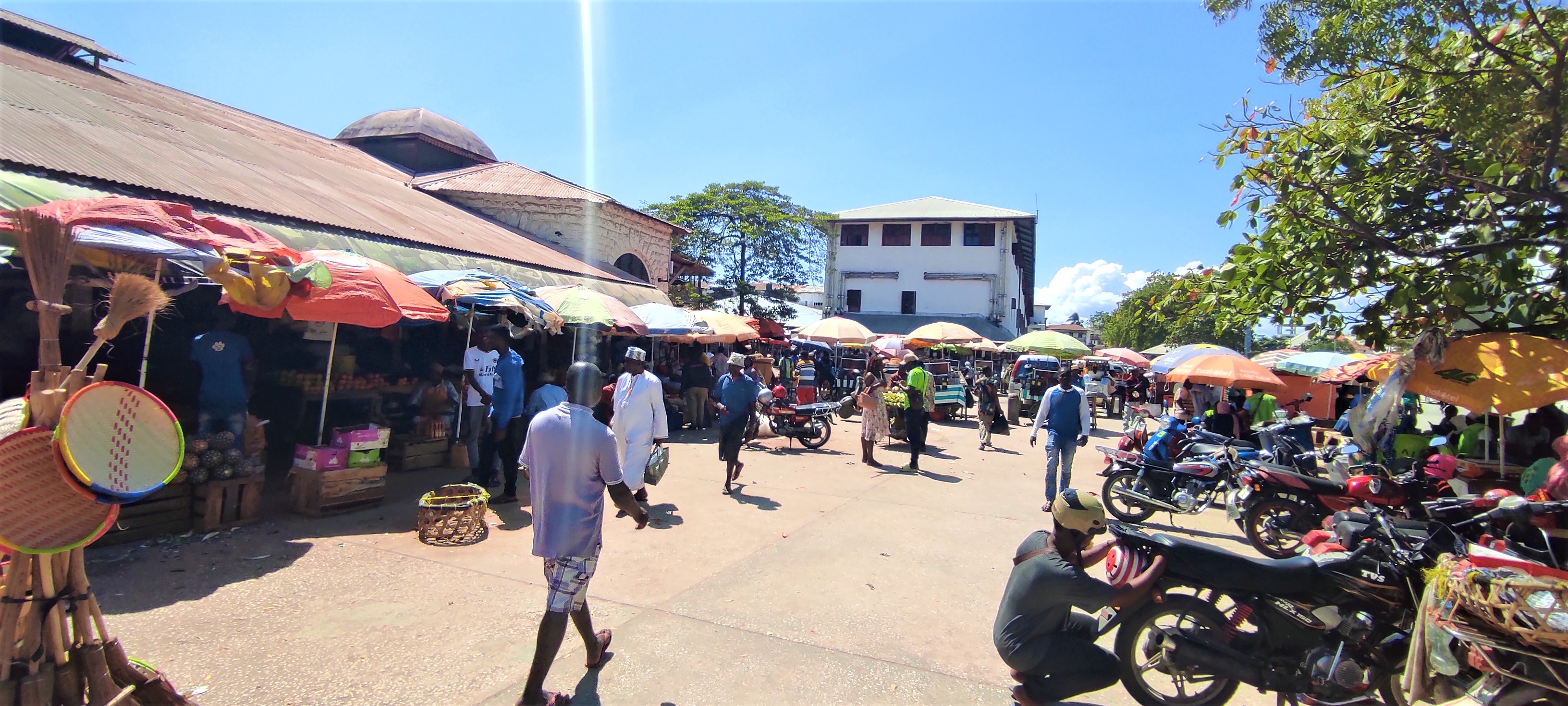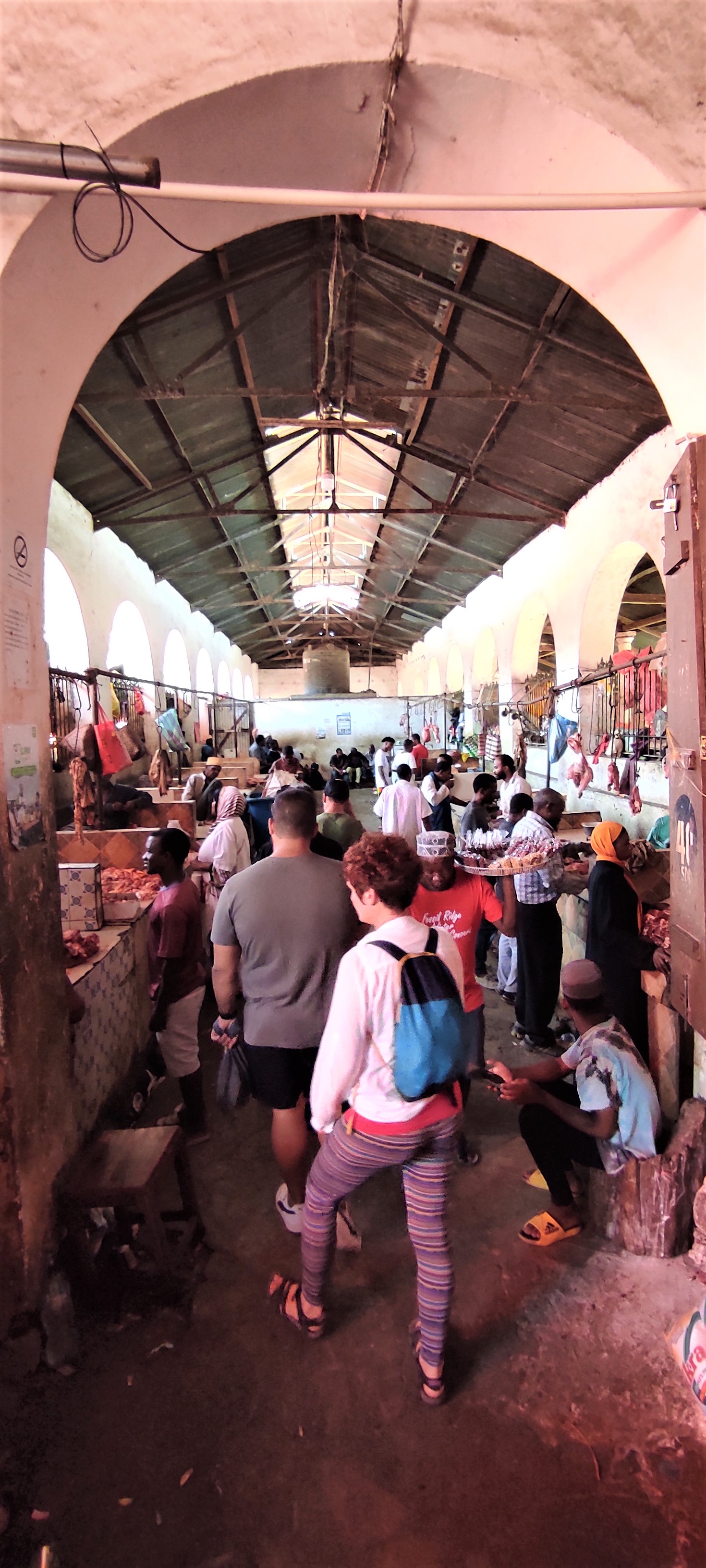 Depois do almoço seguimos viagem para o centro da cidade de Stone Town. Não estávamos muito longe. Pelo caminho, parámos para dar boleia a mais uma rapaz, que seria o guia para o resto do dia. O motorista deixou-nos precisamente junto ao mercado principal da cidade. E lá fomos nós novamente para mais um mercado. O guia deu-nos algumas dicas, explicou o que íamos ver e fazer nas próximas horas. Começou por nos convidar a entrar no mercado.