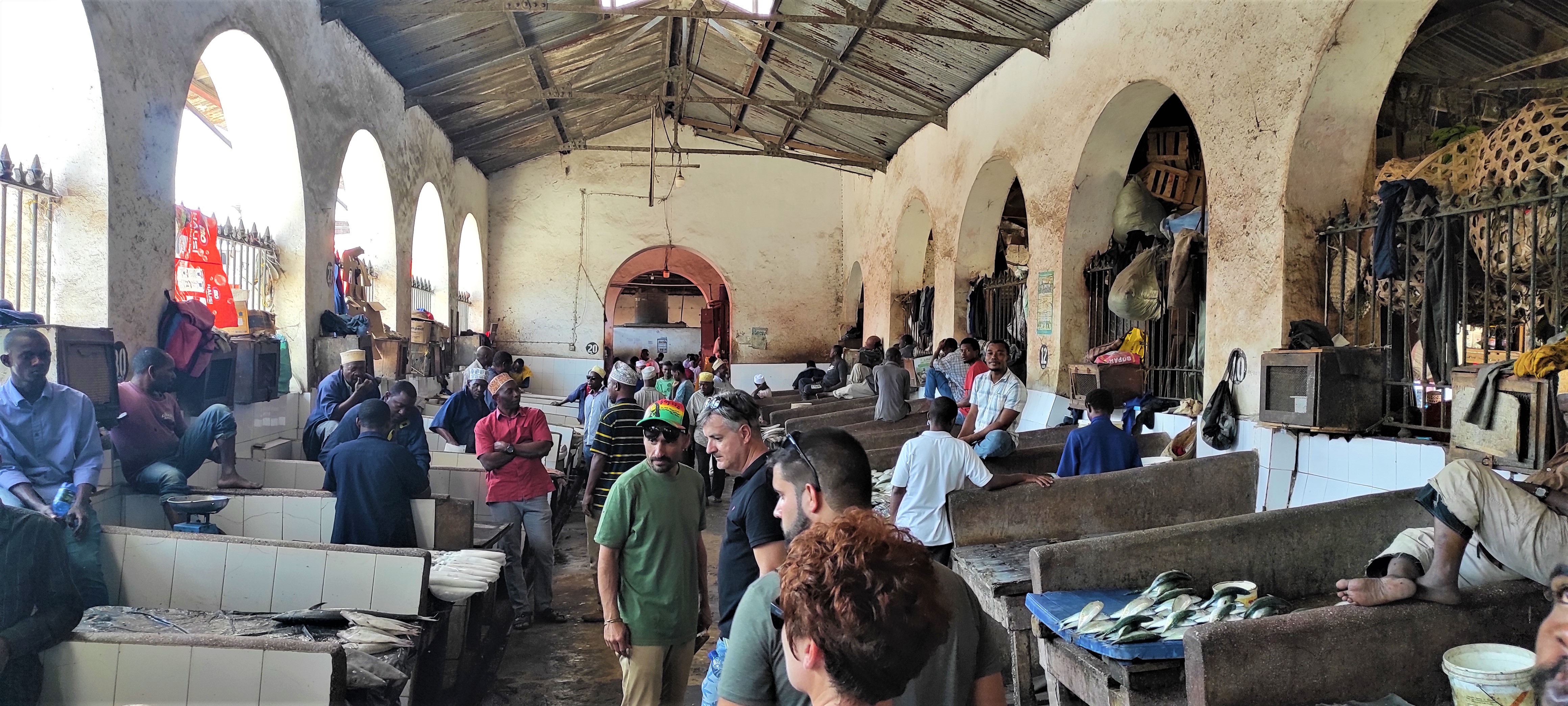 Entrámos no Mercado Darajani e de imediato demos com o talho de um lado e a peixaria do outro. É um caos e pode não ser muito apelativo para todos! O nosso guia observava-nos com muita atenção e percebemos que estava atento aos nossos gestos e atitudes, tentando perceber se algo nos incomodava. De facto, é claramente um ambiente diferente do que estamos habituados: primeiro porque são os homens que comercializam o peixe e a carne, depois o peixe e a carne estão pousados abertamente na pedra ou cimento das bancadas existentes e por fim o cheiro é bastante intenso. Se incomodou? Sim, confesso que nos fez um pouco de confusão, mas já o esperávamos e por isso não nos surpreendeu. Seguimos o corredor que deu acesso à mercearia e zona do vestuário. Era claramente um ambiente mais leve e fluído. Mais uma vez, o mercado explicava-nos a forma de vida desta população, a população do Arquipélago de Zanzibar.