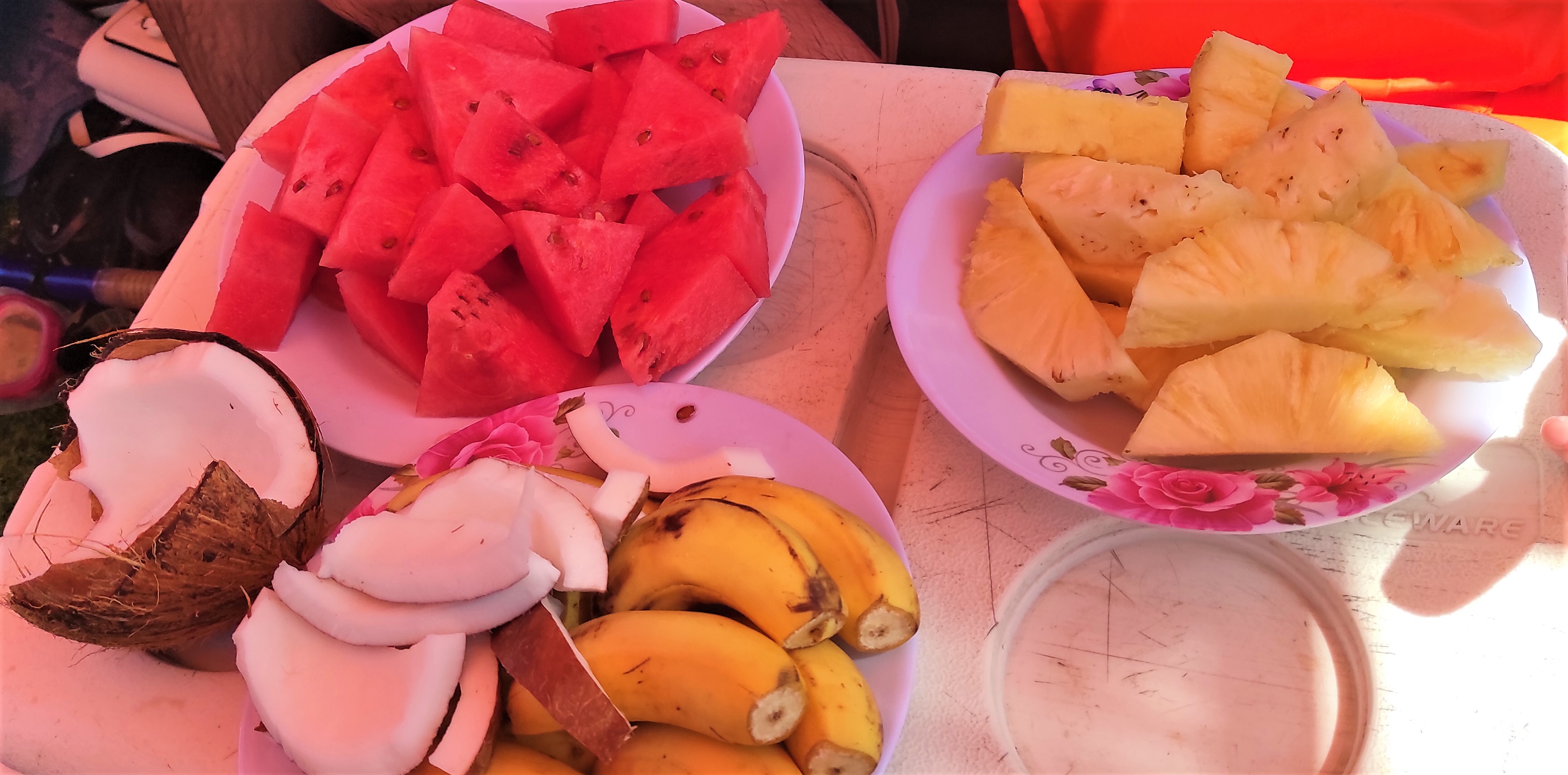 Andámos ali até as mãos começarem a ficar enrugadas. Eu fui a primeira a subir para o barco e assim que entro avisto uma mesa improvisada com um prato de fruta em cima. Para quem (como eu) adora fruta, era a “visão dos Deuses”! Até aquele momento não tinha sentido fome, mas assim que as vi, foi só o tempo de pousar o equipamento de snorkeling. Agarrei-me de imediato à fruta: melancia, banana, abacaxi e coco.