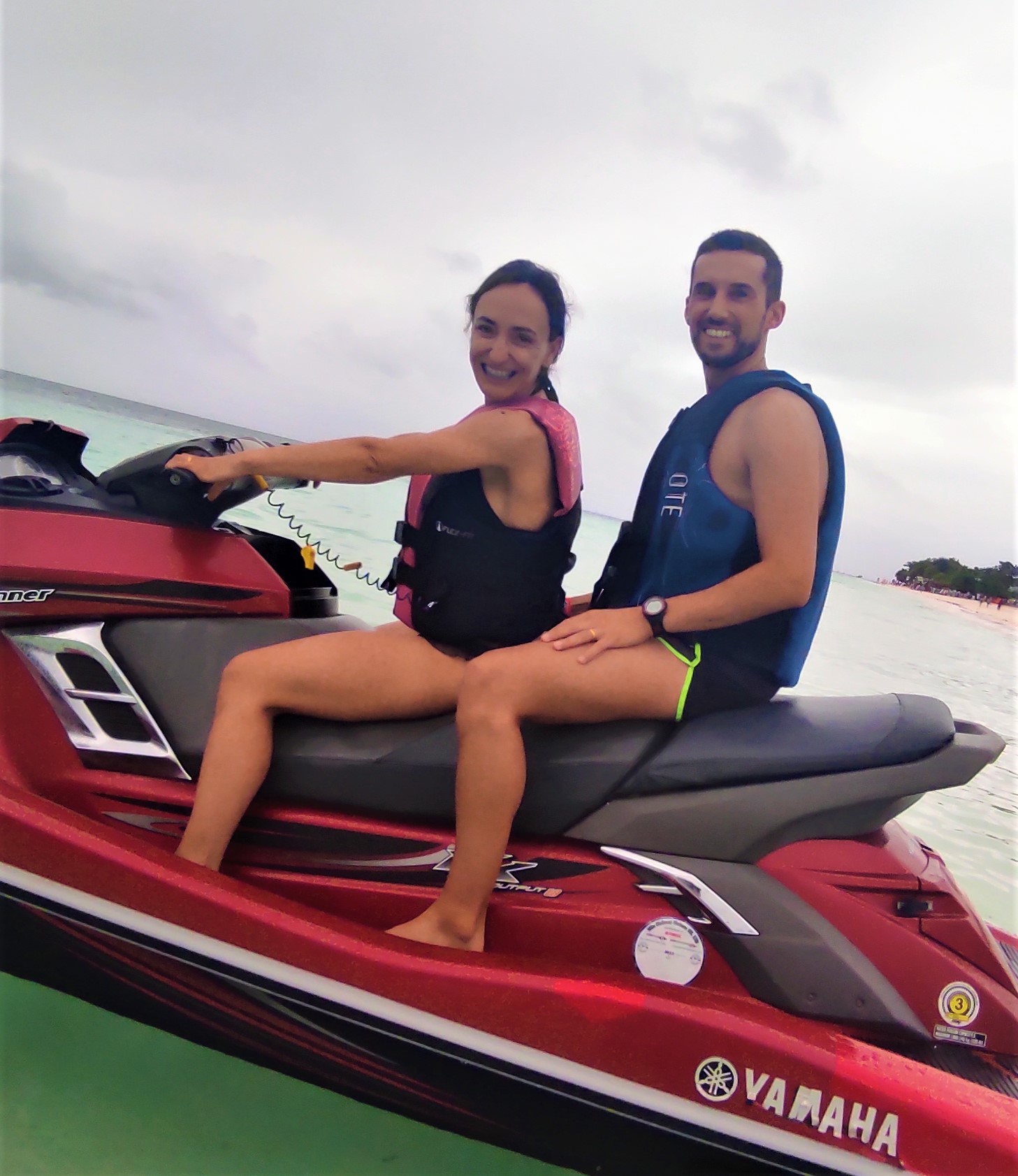 Ainda fugimos da chuva uma e outra vez, mas o dia foi acabando por se ir aguentando o resto da tarde. Fomos ficando por ali até a penumbra da noite chegar, mesmo com o dia encoberto. Tentámos fazer algumas atividades disponibilizadas pelo hotel mas, por muitas e variadas razões, não foi possível. O tempo foi passando e estávamos quase a meio da tarde. Entretanto, o Magno apercebeu-se de um rapaz que estava ali à beira mar e que lhe pareceu estar a tentar vender algo. Aproximou-se e meteu conversa com o rapaz. Estava a alugar a sua moto de água. E pronto, não resistimos e lá fomos nós dar uma volta na moto de água do rapaz. Não tínhamos muito tempo mas ainda deu para uma hora de brincadeira.